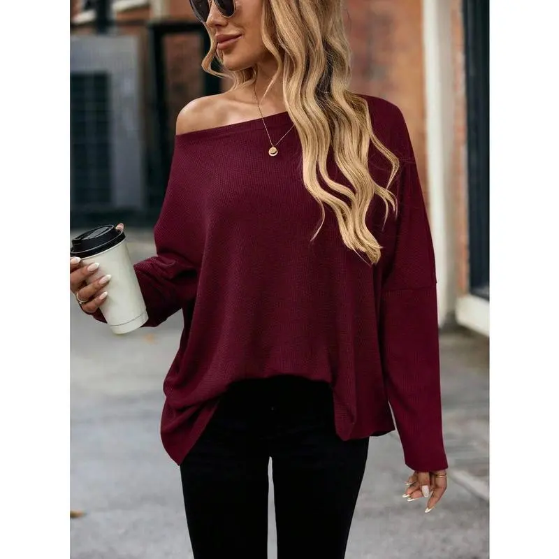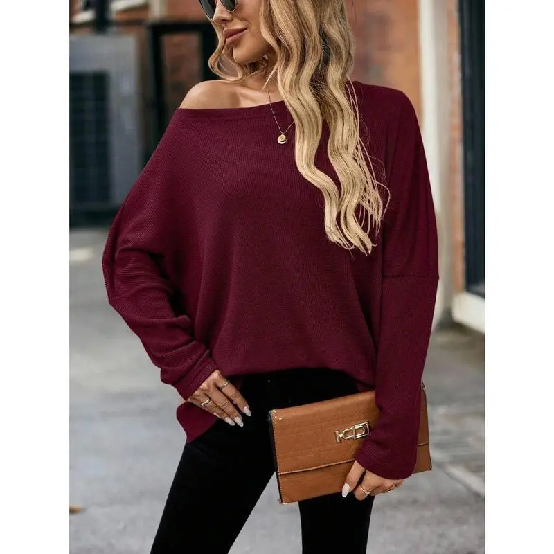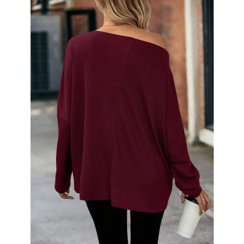 Women's Loose Waffle Knit Off-Shoulder Batwing Sleeve T-Shirt Green Autumn Fabric Fit Casual Oversized Long Sleeve Top fall sweaters cardigans sweaterswomen Knitwear Womenswear