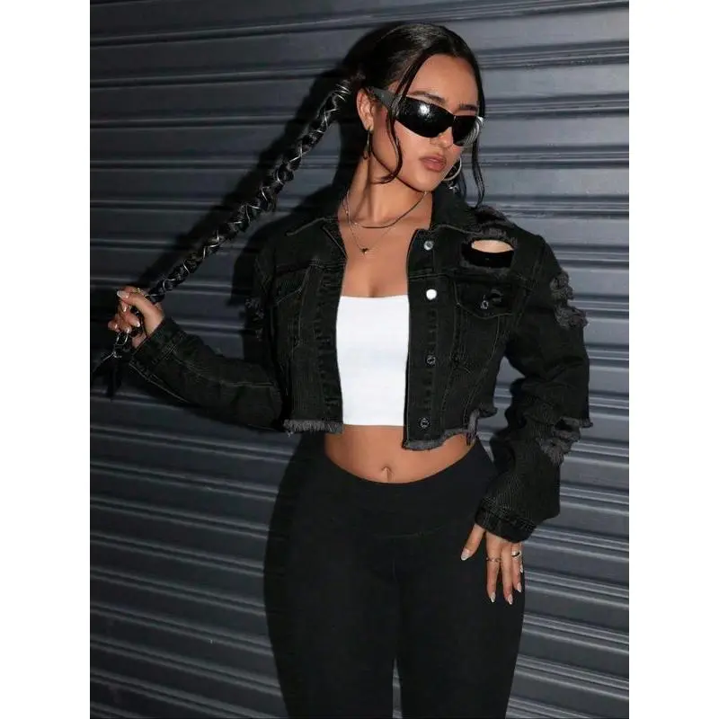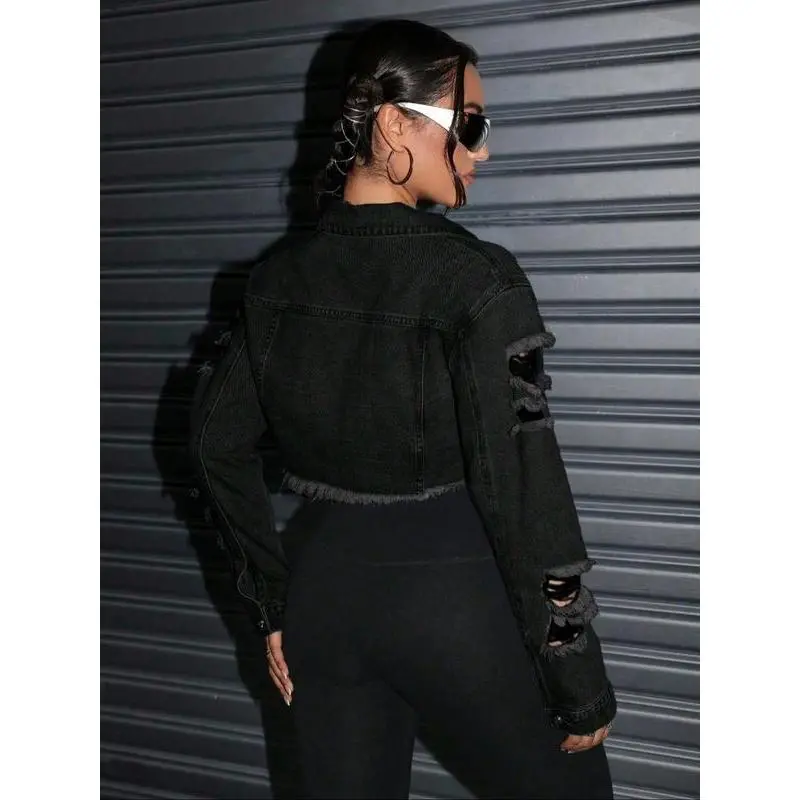 Women'sFashionWashedDenimJacket,ShortFittedJeansCoatwithRippedDetails,TrendyCollaredOuterwearforCasualWear