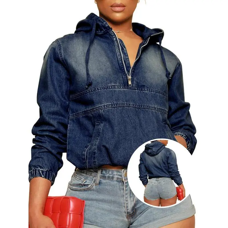 [S-3XL]Women'sHalfZipDenimHoodiePulloverJacketJeanTopsCasual