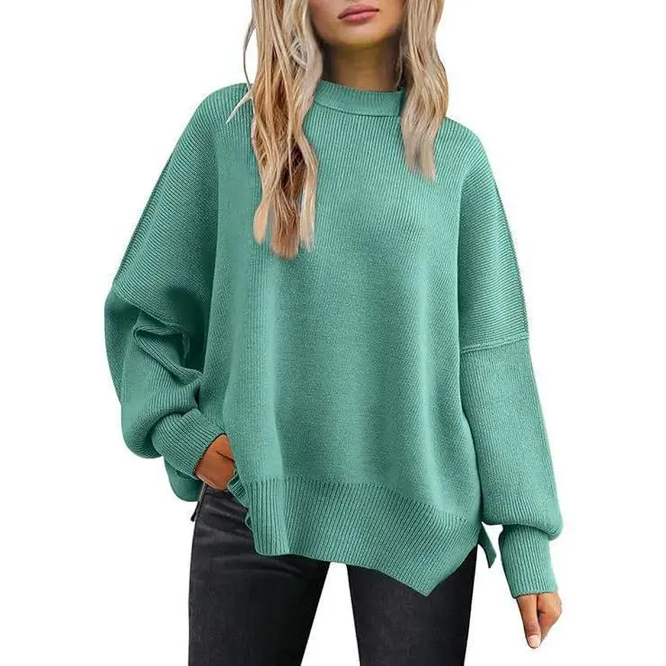 Women's round neck batwing long sleeved sweater autumn oversized ribbed knitted side slit pullover casual women's clothing