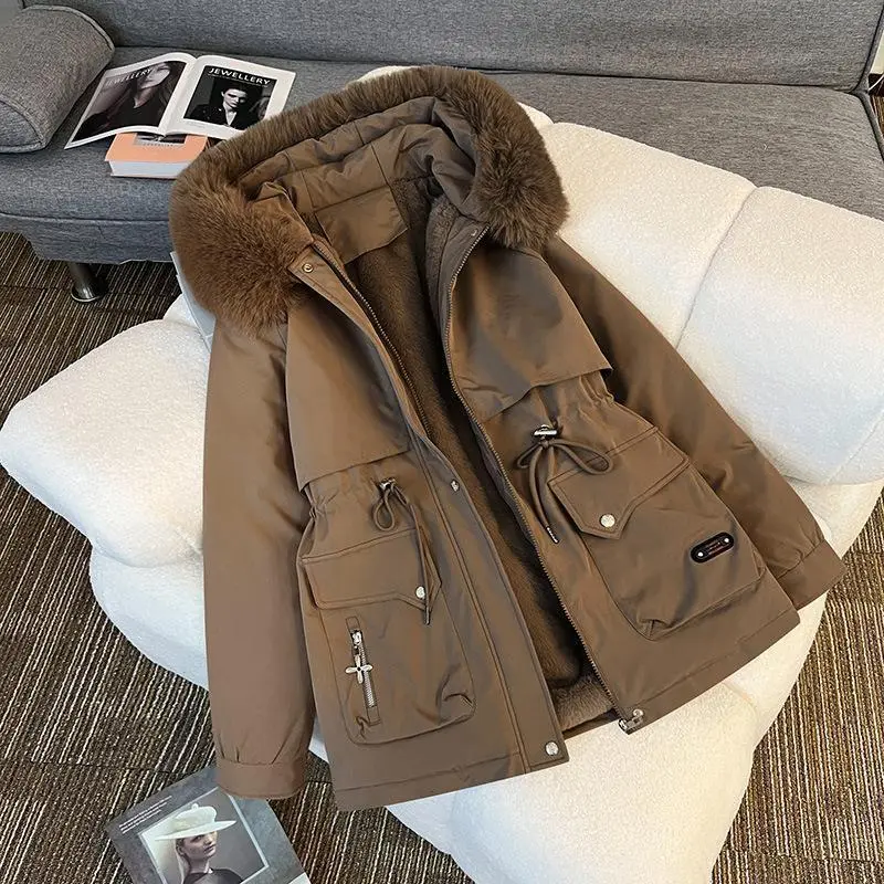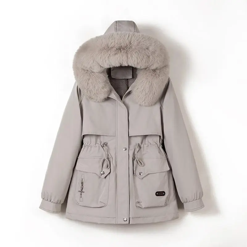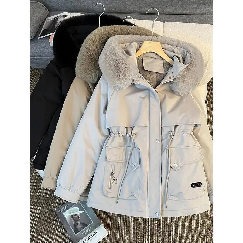 2025 New Women's Parker Winter Wool Collar Cotton Jacket Fashion Multi functional Hooded Warm Cotton Jacket