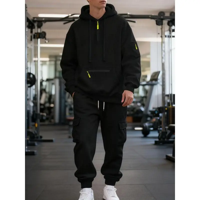 ��Thick Fabric��: Constructed from a thick knit, ensures warmth and durability during fall and winter activities. ��Half-Zip Feature��: Incorporates a half-zip design on the hoodie, allowing for adjustable ventilation and ease of wear. ��Fitted Cut��: Offers a fitted silhouette, providing a tailored look without compromising on freedom of movement. ��Above Ankle Length��: The pants feature a below-the-ankle length, suitable for pairing with a variety of footwear options. ��Practical Pockets��: Equipped with utilitarian pockets on the pants, these allow for secure storage of essentials during activities.