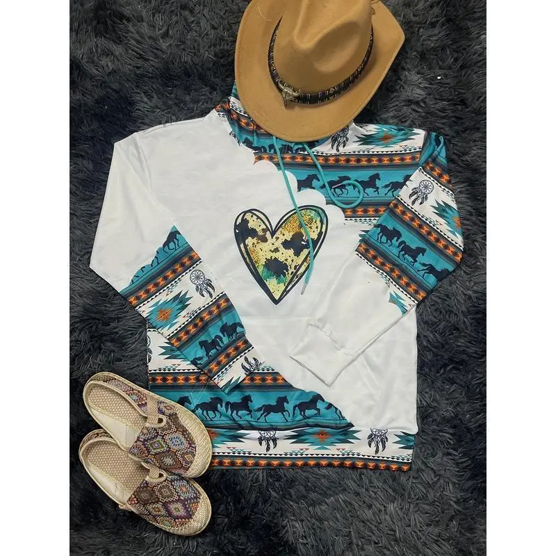 Aztec Geo Print Kangaroo Pocket Hoodie, Casual Long Sleeve Drawstring Hoodies Sweatshirt, Women's Clothing Womenswear Tops