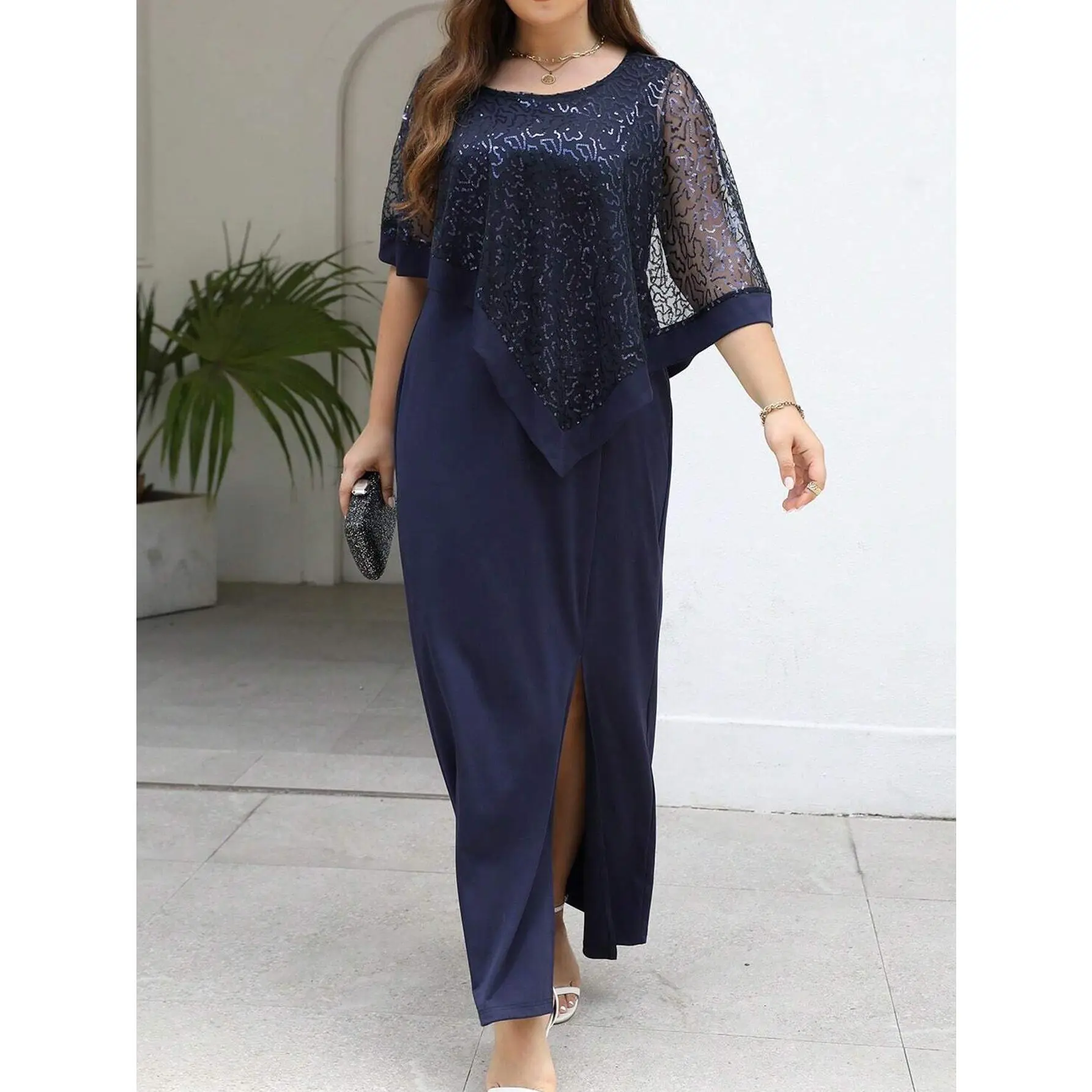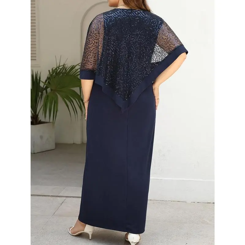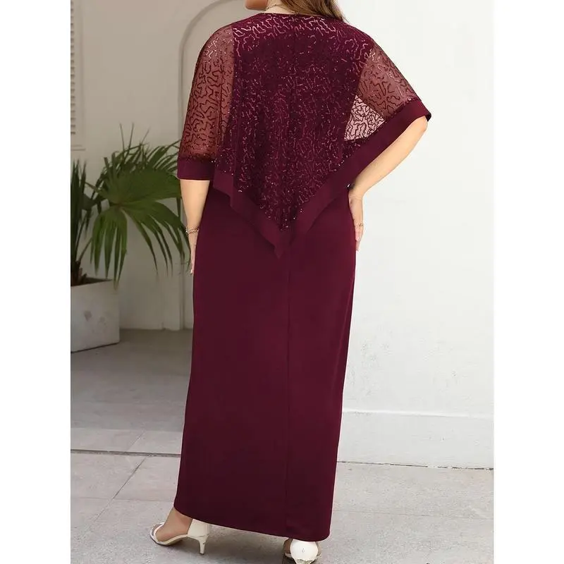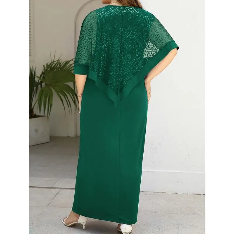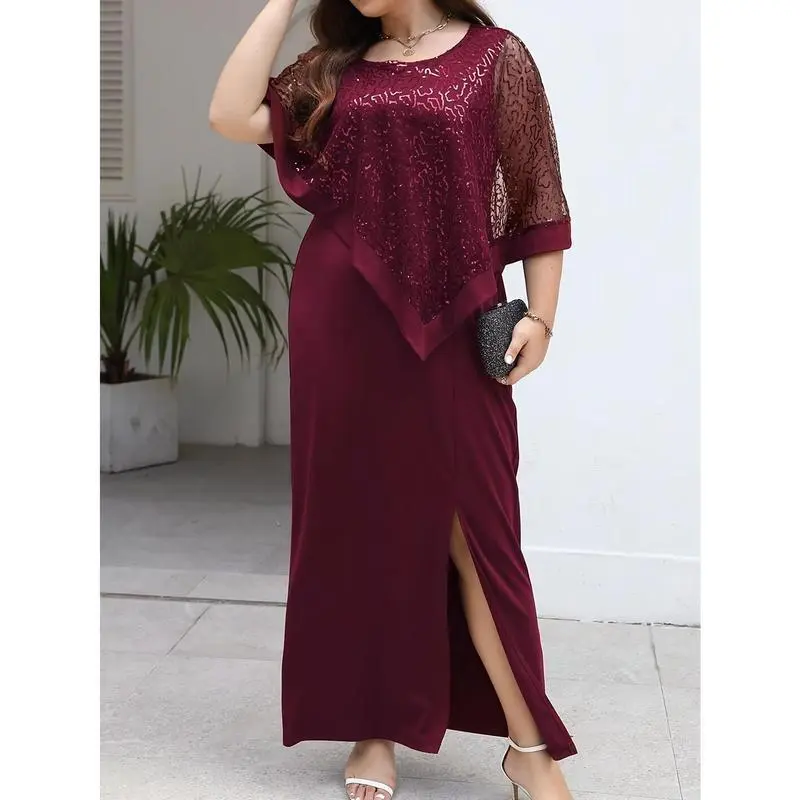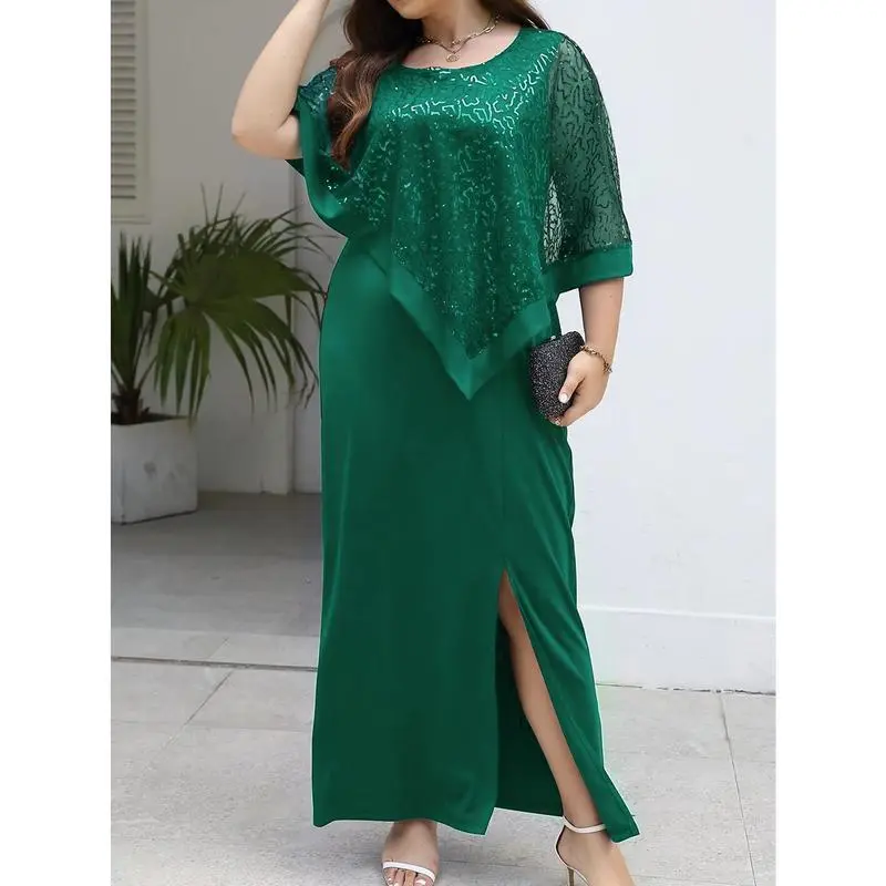 Plus Size Friendly Spring/Summer New Dress Waist Elegant Long Skirt Elastic Comfortable Plus Size Business Commute Batwing Sleeve Sequin Patchwork Slit Dress Round Neck Hot Selling TOP1 Party/Dinner/Gala Dress