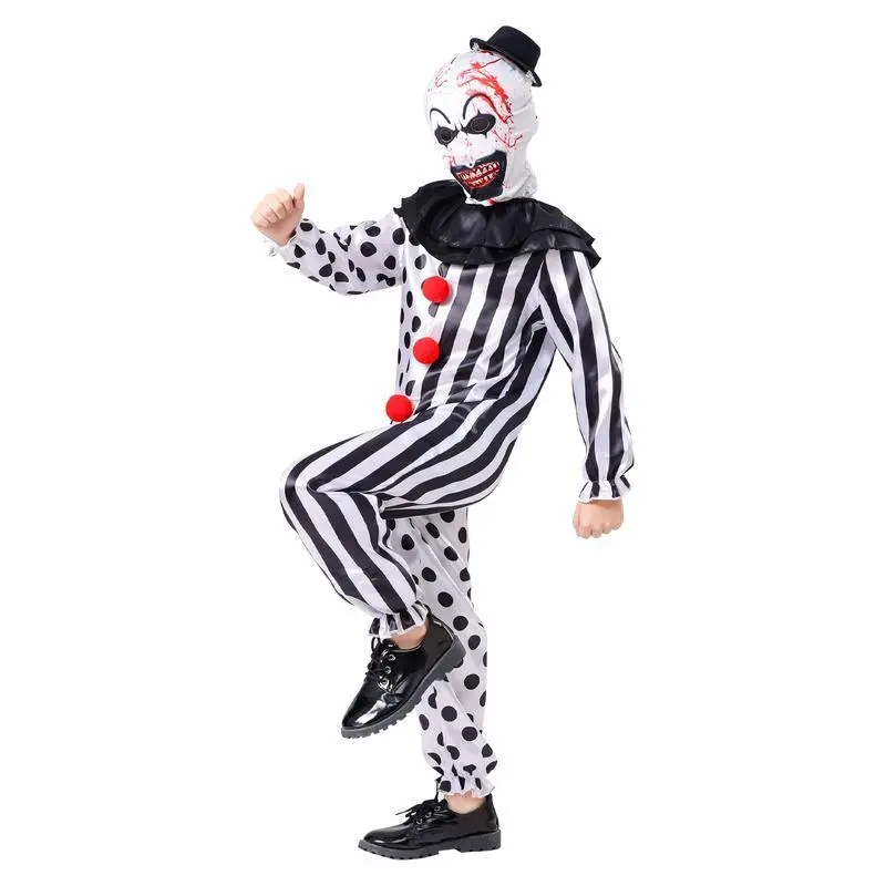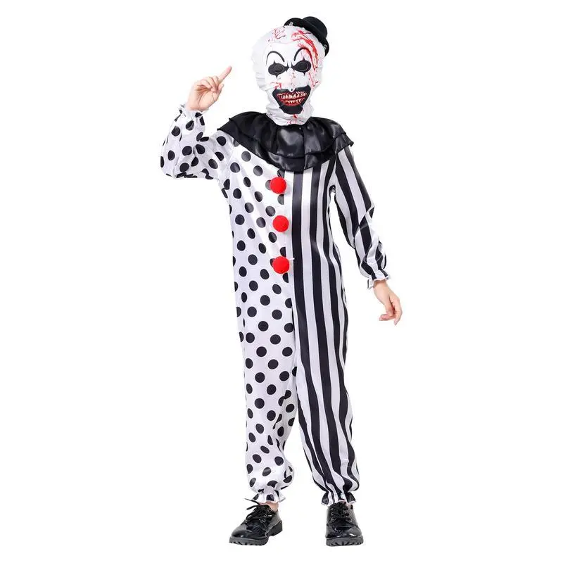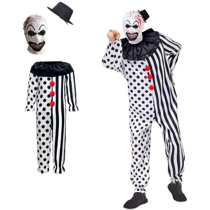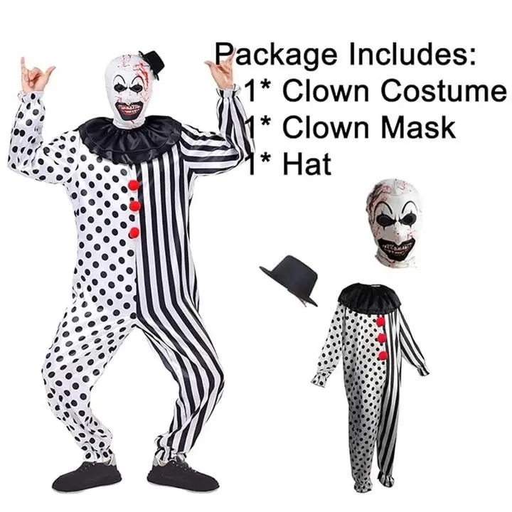 Unisex Adult And Kids Clown Costume Jumpsuit Black and White Halloween Outfit Scary Killer Cosplay with Mask Hat