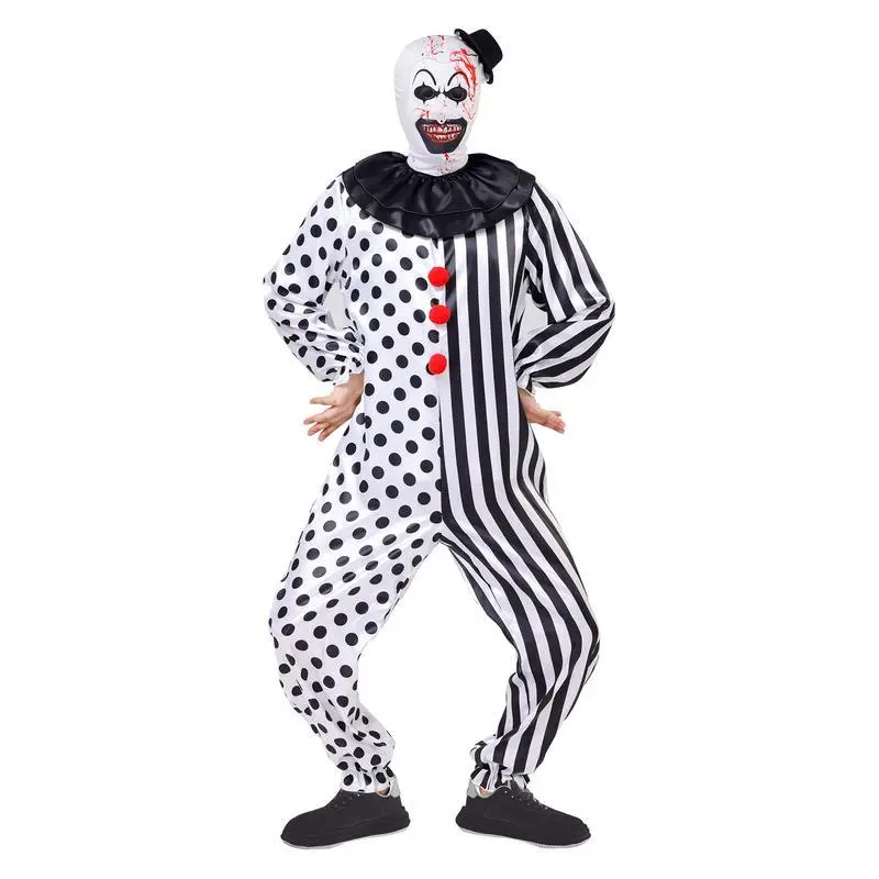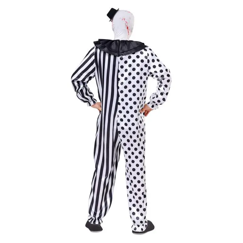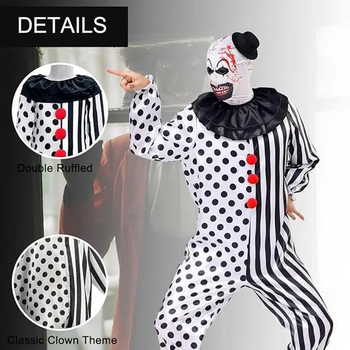 [3 PCS Costume Set for Adults] Halloween killer clown costume includes 1* black and white clown costume, 1* killer clown mask and 1* hat. perfect outfit for the halloween. This horrifying clown mask is designed with bloody stains on it. The clown jumpsuit features a black and white clown design with a ruffled collar and pom-pom accents. Dress yourself up the best horror killer clown this Halloween�� [Spooky and Terrifying] Get ready to dress yourself up to spook everyone this Halloween with our terrifying Killer Clown Costume! This costume is perfect for anyone who love a good scare and wants to stand out at any Halloween party. [Premium Material] Crafted from high-quality fabric, the jumpsuit is surprisingly soft and comfortable for everyday wear. Hand Wash Cold. Line Dry. Do Not Bleach. Easy to wear, care for, and clean. Made out of 100% polyester. Safety material, breathable. [Occasions] This clown outfits can be a fun and unique choice for themed parties or events, such as Halloween dress up parties, boys horror costume, Scary theme party, spooky theme party, killer clown role playing, activity, everyday play and more! They are also sometimes worn as part of a theatrical or performance costume. Note: Pls refer to the size chart before your purchase. Free exchange or return if you are unsatisfied; If you have any questions before or after your order, just feel free to contact us for customer service.