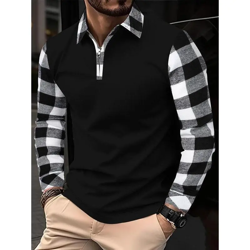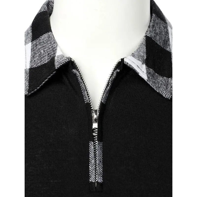 Men's Patchwork Plaid Print Polo Shirt ? Half Zip Feature ?