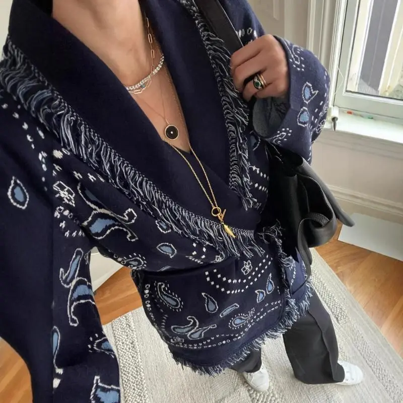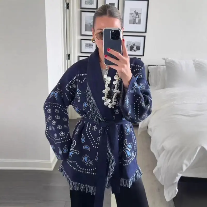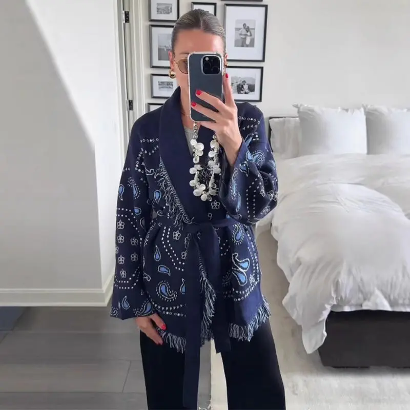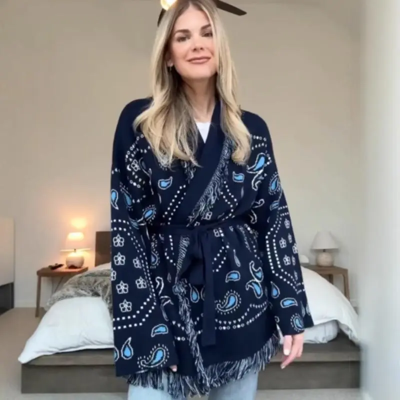 Elegant Tassel Stitching Knitted Printed Cardigan Women's Sweater Belt Long Sleeve V-Neck Color Thickening Fashion Sweater 2025 Knitwear Loose Blue Fitted Medium Winter Tops Piece Womenswear Casual Style