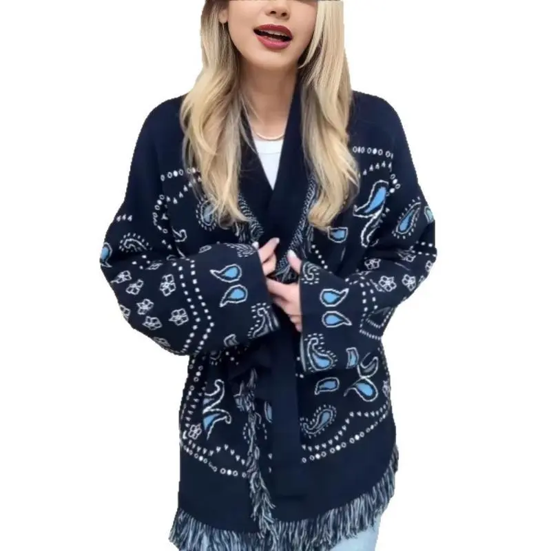 Elegant Tassel Stitching Knitted Cardigan ? Title: Tassel Stitching Knitted Printed Cardigan Women's Sweater Belt Long Sleeve V-Neck Color Thickening Fashion Sweater 2025 Knitwear Loose Blue Fitted Medium Winter Tops Piece Womenswear - Casual This cardigan features an irregular pattern and medium thickness. It's a single piece with a loose style. The length is ordinary (50cm). Perfect for casual wear, it combines comfort and fashion. ?? Ideal for Winter This cardigan is ideal for winter tops. It's a fitted medium piece, suitable for women's casual wear. The blue color adds elegance. Perfect for layering or wearing alone. ??
