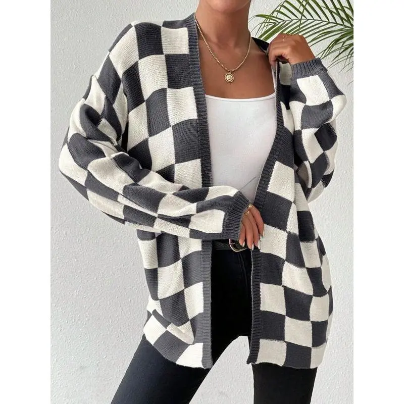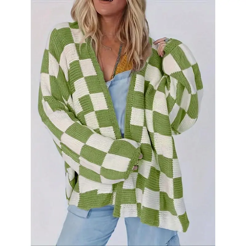 Women's color blocked checkered loose sweater cardigan, soft and comfortable fashionable knit sweater, retro style long sleeved pullover
