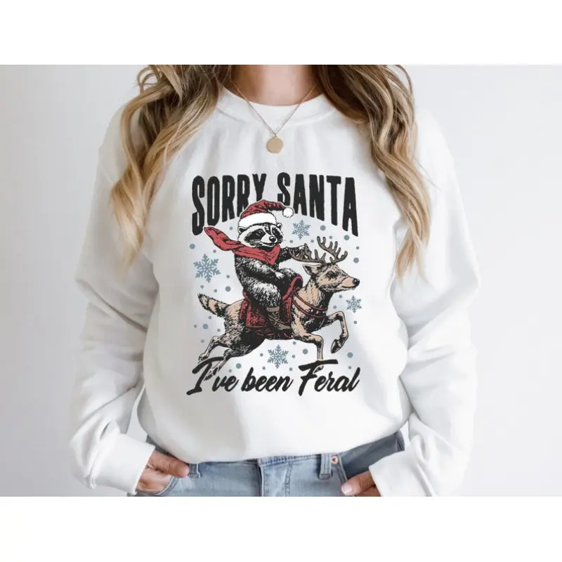 Celebrate the holidays with a wink and a cuddle in the Sorry Santa, I've Been Feral, Christmas Raccoon, Funny Sweatshirt. This cheeky, cozy piece blends festive flair with everyday comfort, making it the perfect layer for gatherings, gifting, or simply getting through the season with style. Built for warmth and durability, this sweatshirt features a soft fleece interior and a high-quality cotton/polyester blend that stays bright and comfortable wear after wear. The bold retro raccoon graphic pops on a range of festive colors, turning heads and sparking smiles wherever you go. How to wear: This cute sweatshirt pairs beautifully with jeans for a relaxed, everyday look, or can be layered over tees for added flair. Perfect for holiday gatherings, winter outings, cozy nights in, or gifting to friends and family who love festive, retro style. Embrace the season in comfort and character with this adorable retro Christmas raccoon sweatshirt. Add it to your cart today and wear your holiday cheer with confidence.