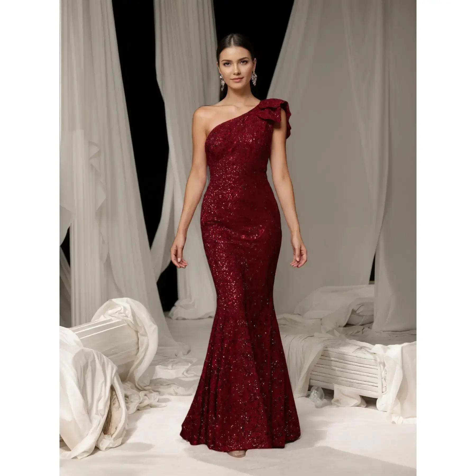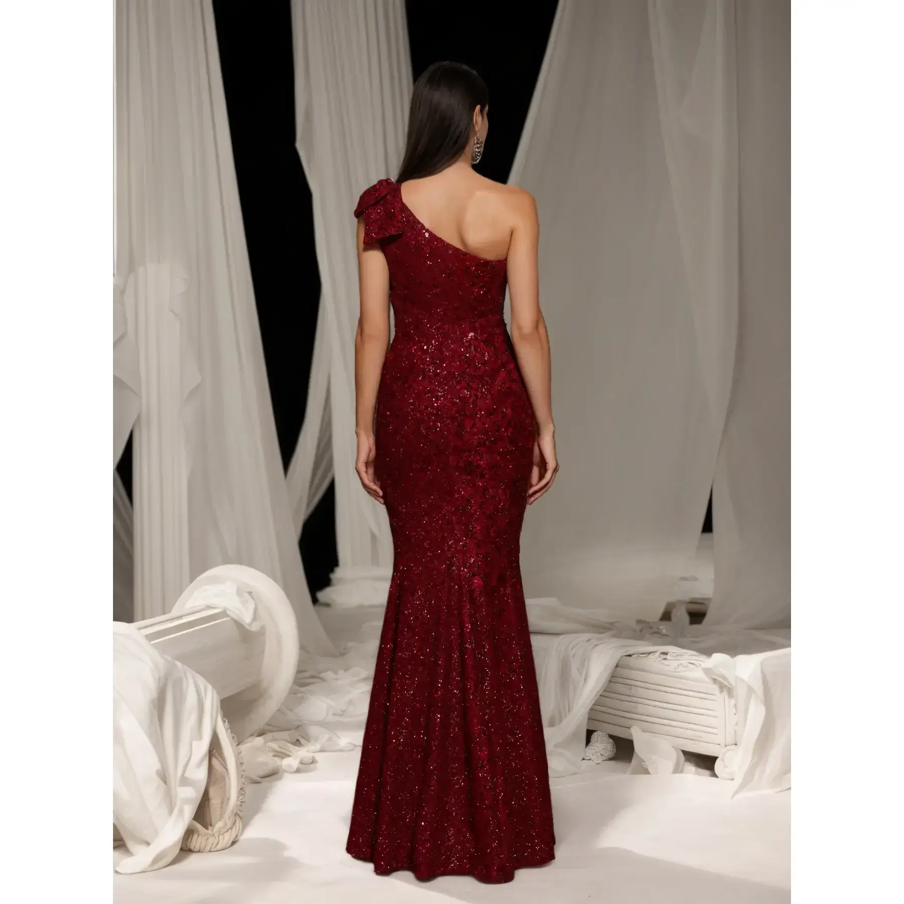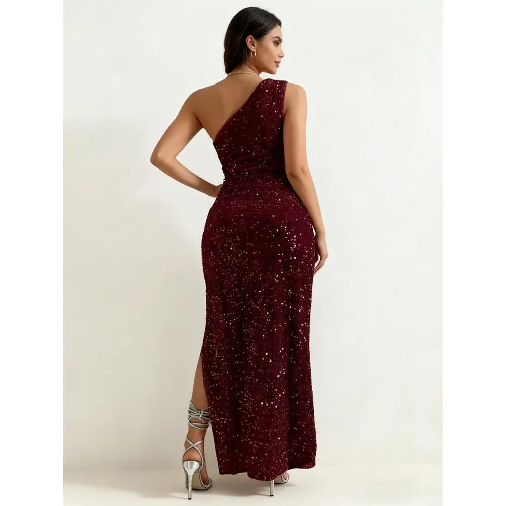 Elegant Wine Sequined One-Shoulder Mermaid Dress, Slim Fit, Formal Occasions, Evening Party, Wedding, Prom, Formal Wear