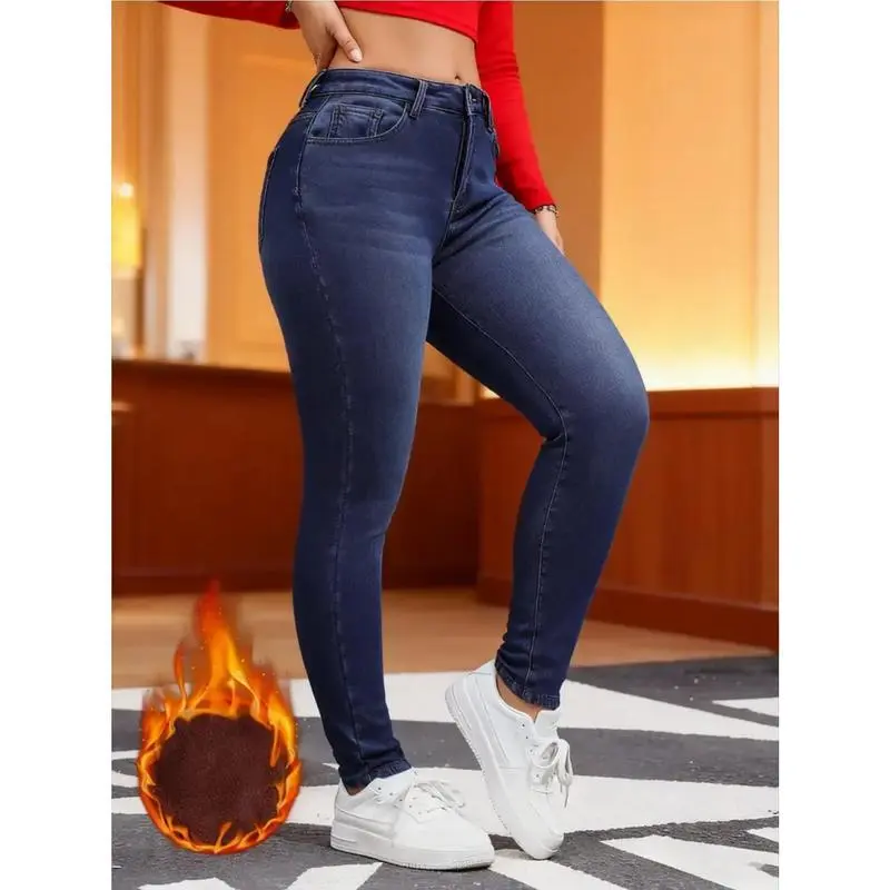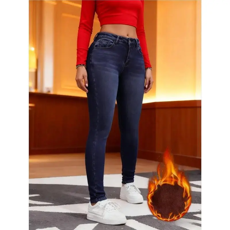 Women'SHigh-WaistedSkinnyJeans-WinterFleece-LikeWarmthStretchPants,BlueWashedButton-FlyClosure,Heavy-DutyMid-RiseTrousersforCasual&FormalWear(MachineWashable,LongLength)-WinterJeansforJeansBars,LowWaistedJeansforWomen