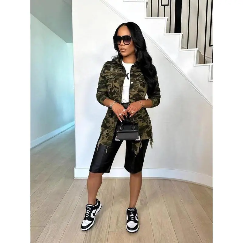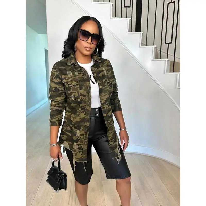 Women's Camo Print Ripped Button Front Shirt, Casual Long Sleeve Collared Top for Daily Wear, Ladies Clothes for All Seasons double lining type negative