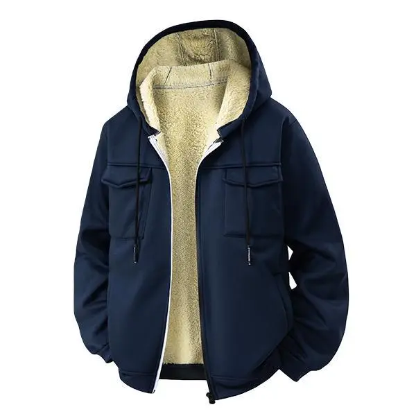 Multi-pocket workwear fleece-lined hooded jacket, featuring a comfortable and casual hooded design with a stylish interior, suitable for winter outings, workwear fashion, and trendy social media looks.