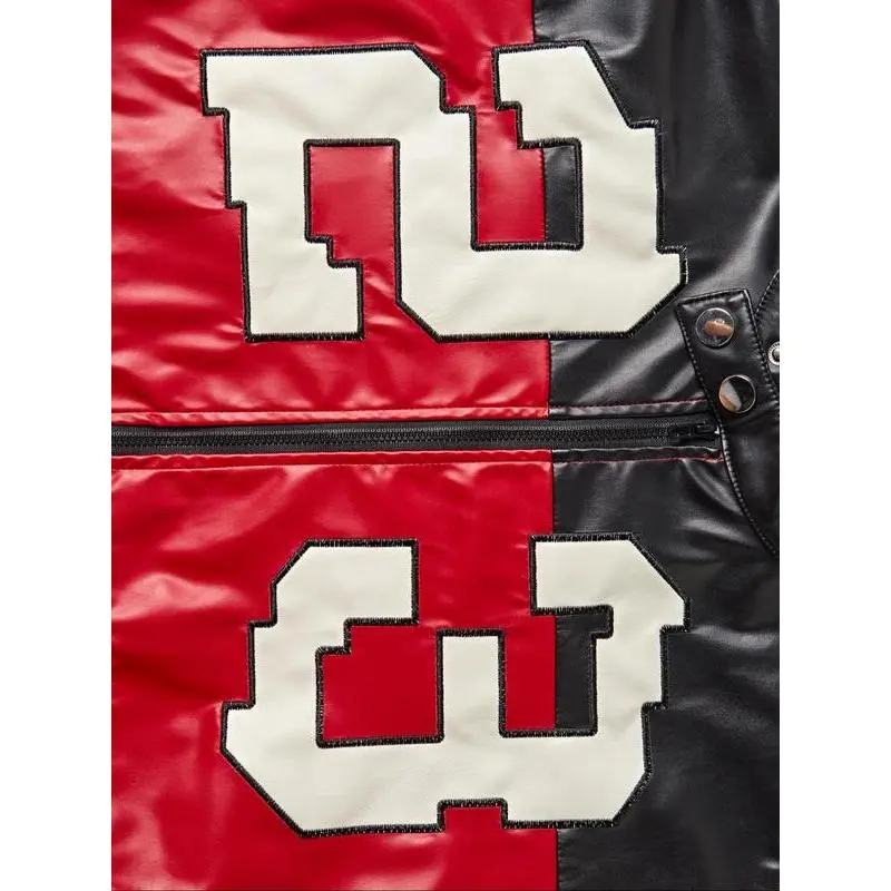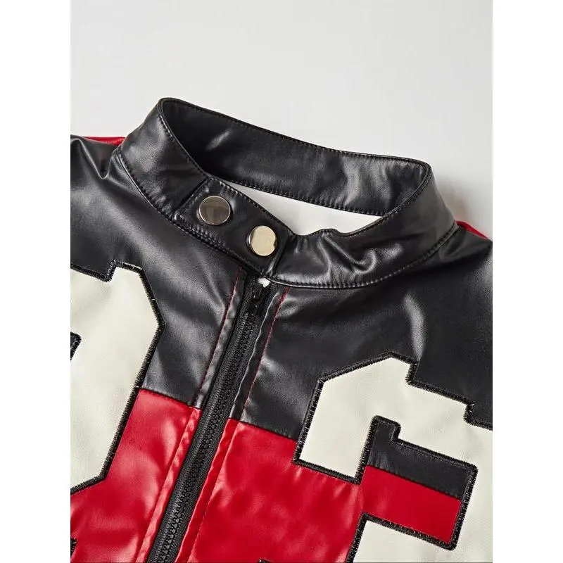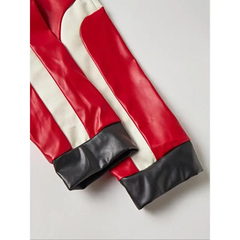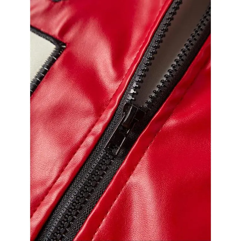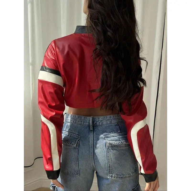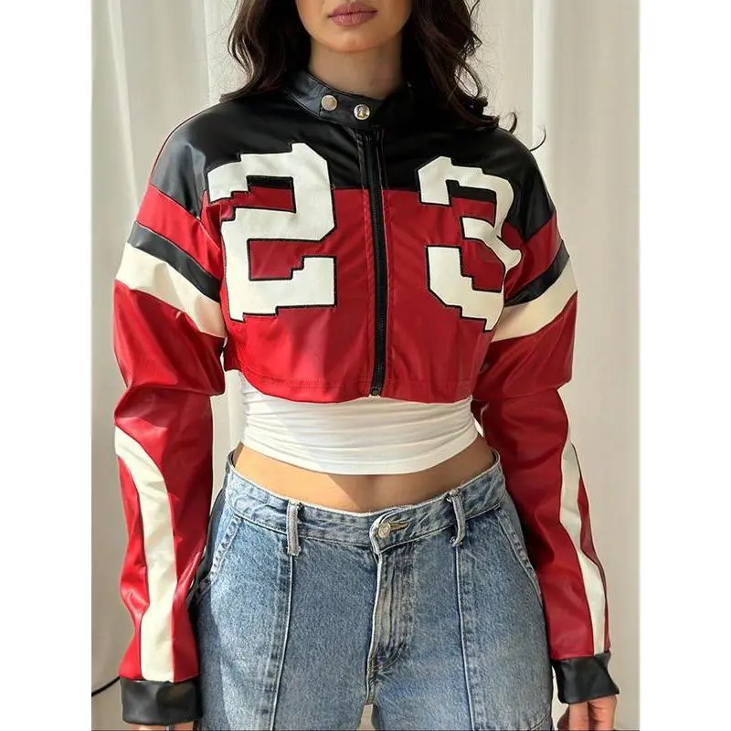 Women'sCroppedBaseballJacketRedBlackColorblockFauxLeatherShortCoatwithNumberPrintZipperFrontLongSleeveStreetwearFashionMotoBikerStyleCasualOutwear