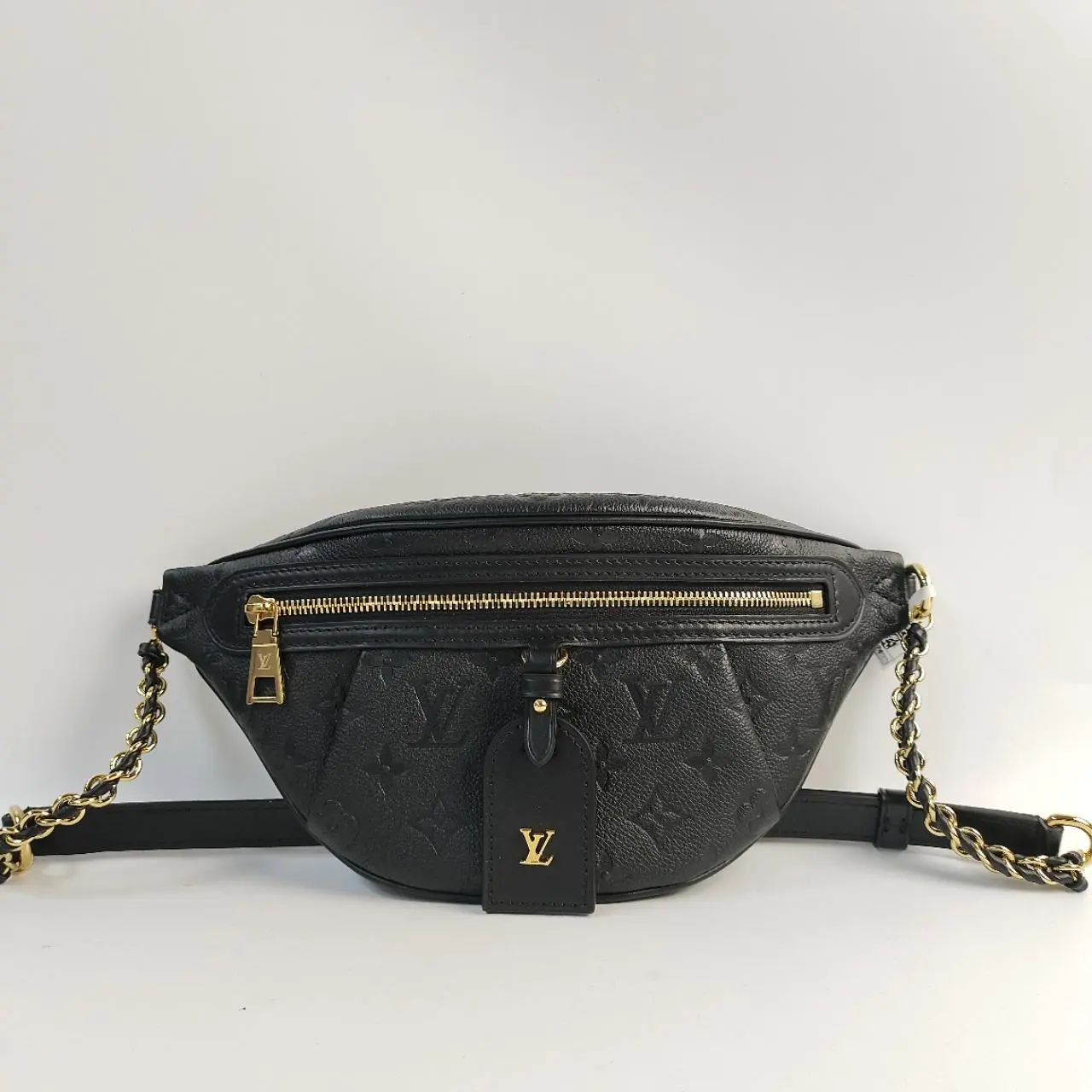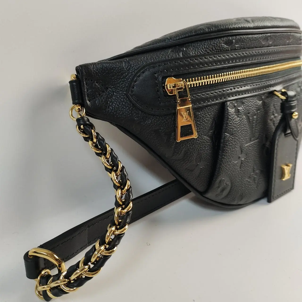 This iconic Mini Bumbag from Louis Vuitton reinterprets the classic waist bag design with the brand's signature Monogram Empreinte leather—a supple grained cowhide with delicately embossed monogram motifs, paired with polished gold-tone hardware for a timeless luxury finish. Crafted in Noir black, it features a microfiber interior lining and premium cowhide leather trims, striking a perfect balance of durability and softness