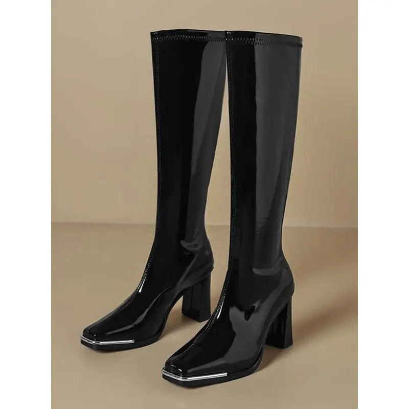 Women's Knee-High Thick Sole Boots, Side Zipper Design, Elastic Split Detail, Almond Toe, Stacked Square Heel, Fall Fashion Shoes