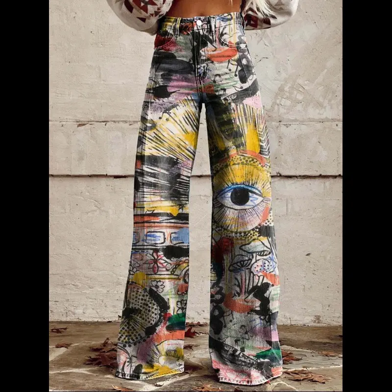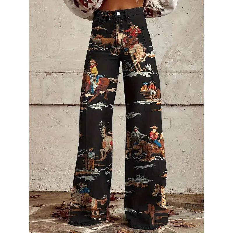Women'SWesternCowboyPrintJeans-LightweightStraightLegPantswithCowboyMotifs(Horses,Cacti,Cowgirls)-High-WaistLoosePants,VintageStyle,ComfortableFashion,Wide-LegJeans,Non-StretchFabricforWesternThemeParties,EverydayOutfits-