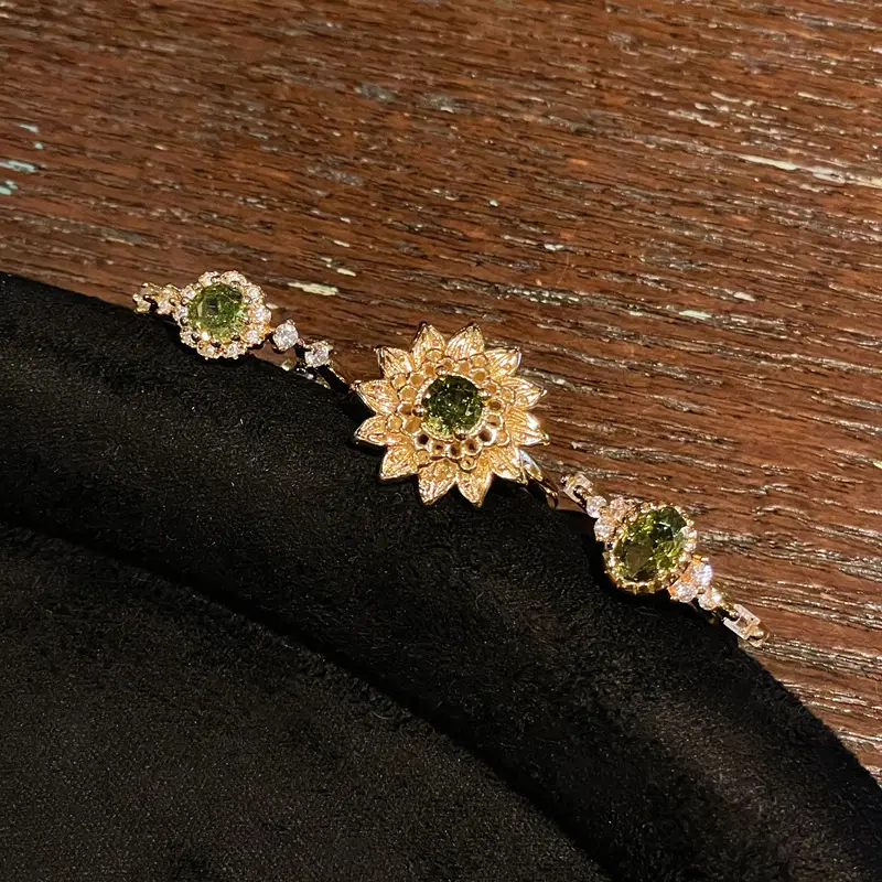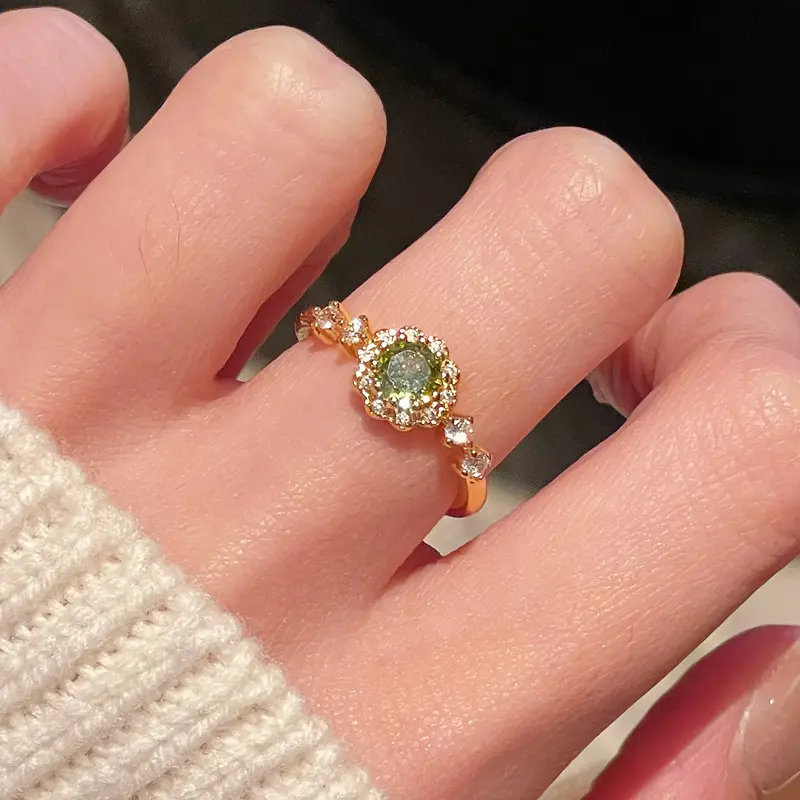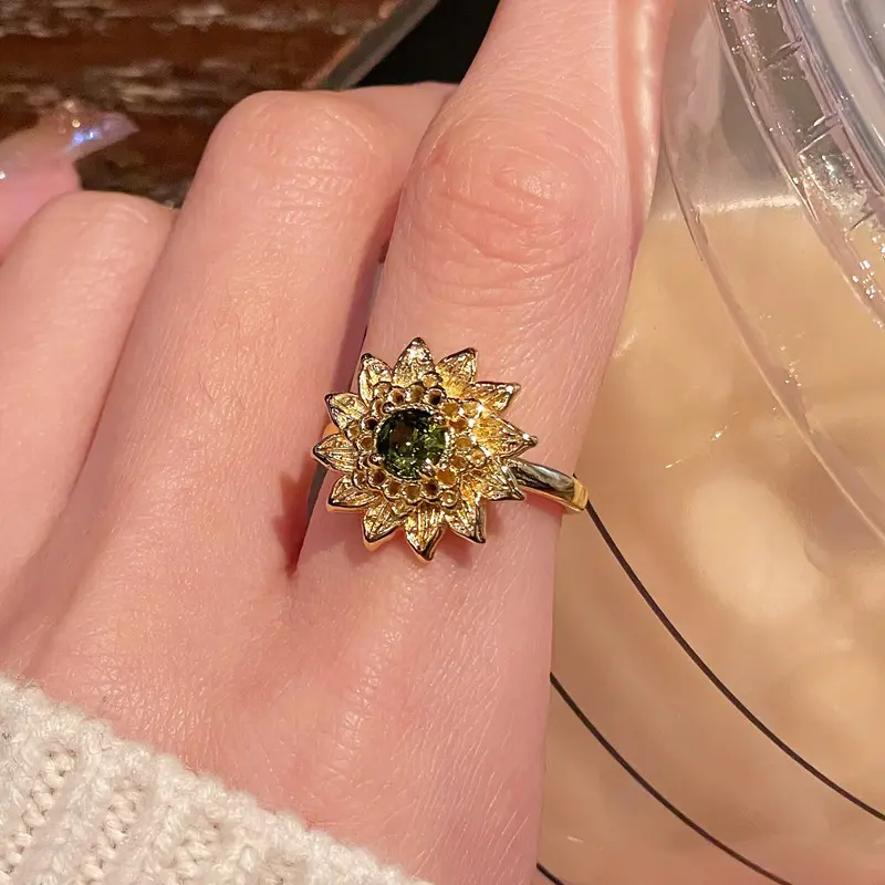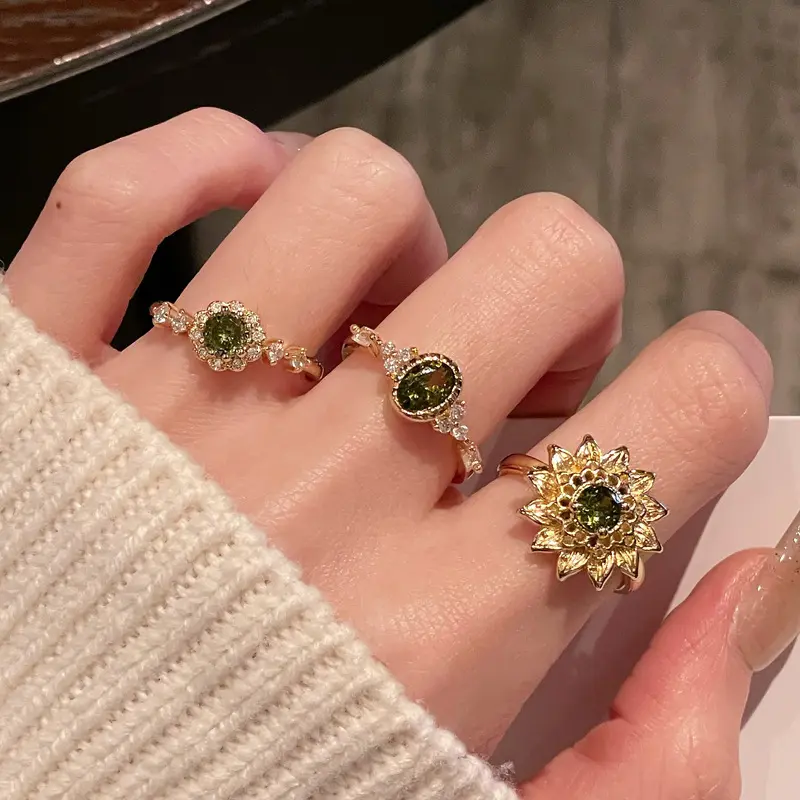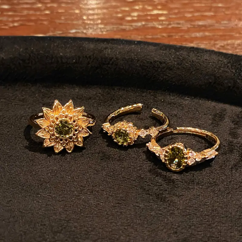 Fashionable and trendy sunflower vintage French retro light luxury high-end exquisite ultra-shiny accessory green diamond zircon gemstone open ring gift