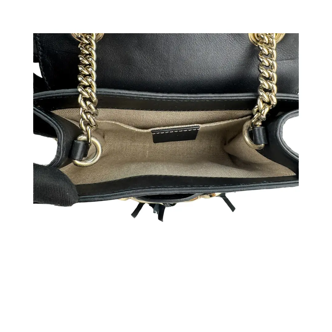Black GG-embossed leather exterior with beige canvas interior and silver-tone hardware. Features chain strap with leather shoulder guard, horsebit and tassel detail, tab closure, and interior pockets. Includes certificate of authenticity and original dust bag.Measures 7" W x 5" H x 1" D, with a 20" strap drop.