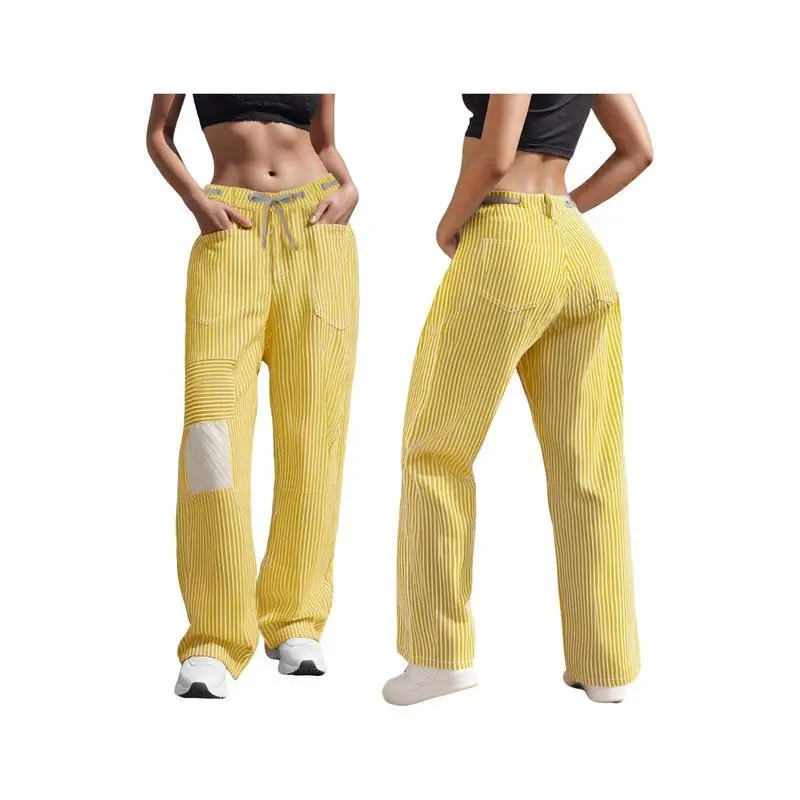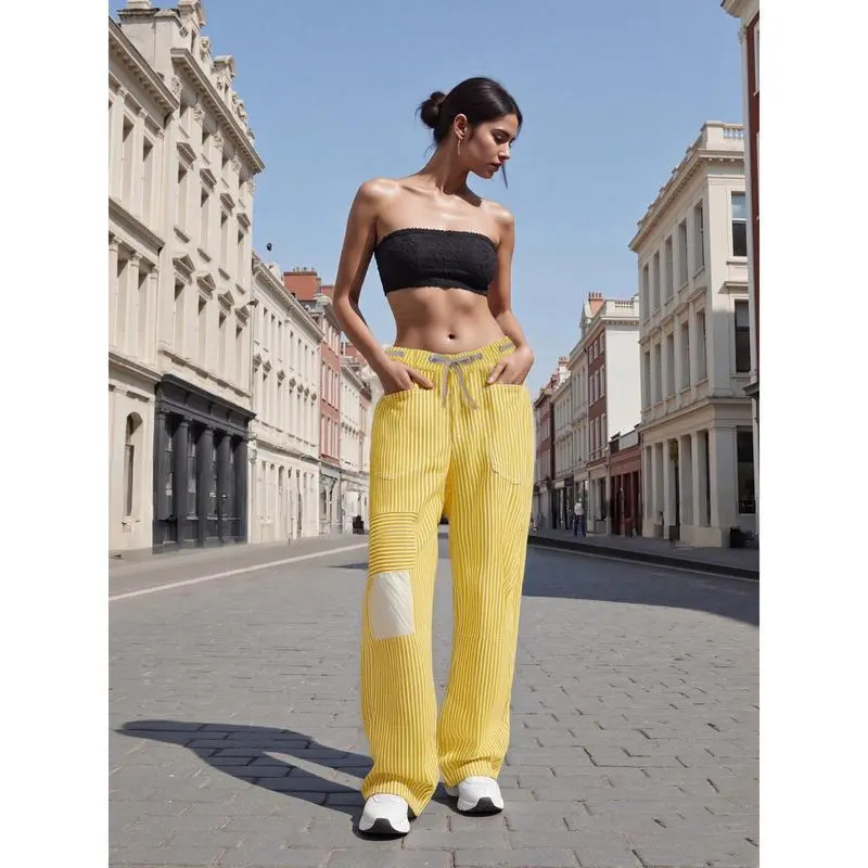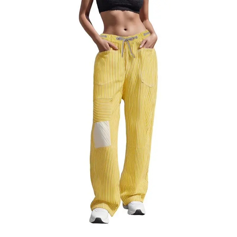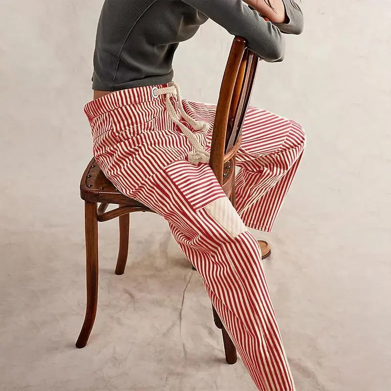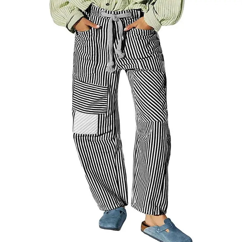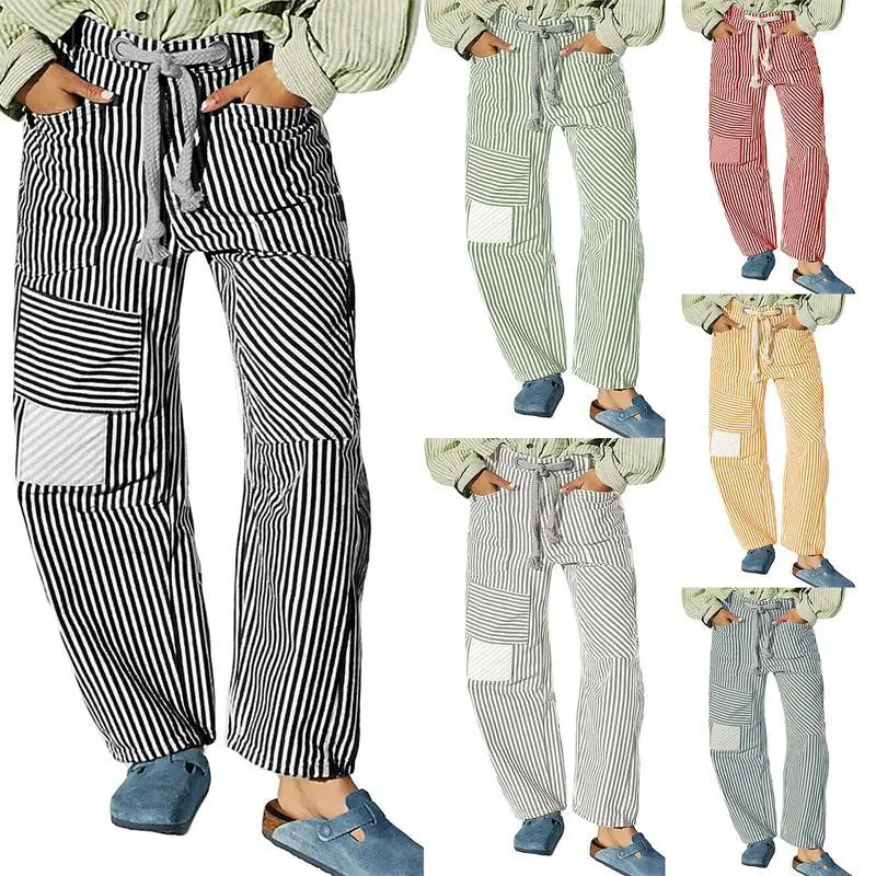 WomenStripedPants,ElasticWaistDrawstringPatchworkWideLegPantsLooseTrouserswithPocketsCasualCotton