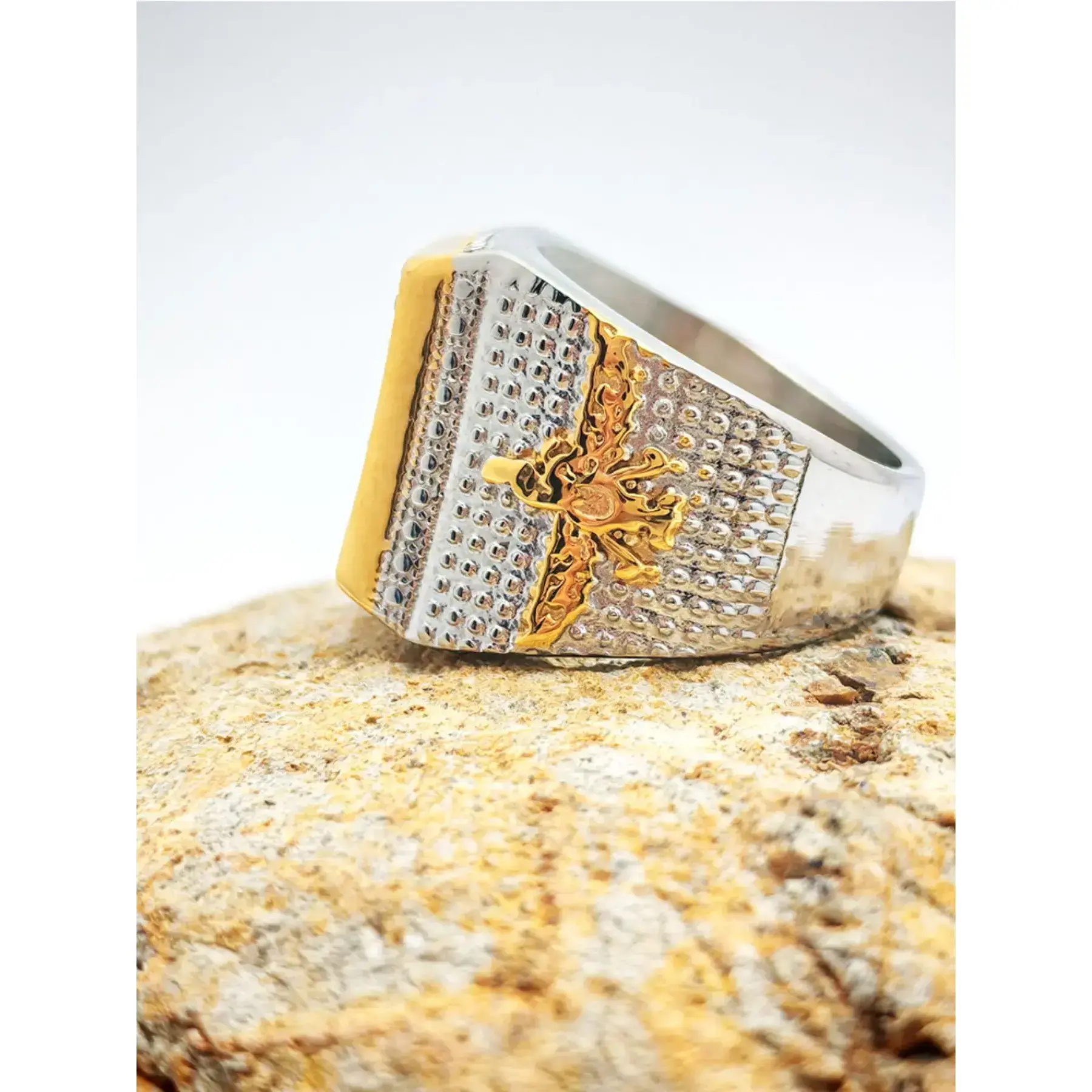 【Titanium Steel】: Crafted from titanium steel, this ring ensures durability and a long-lasting shine without tarnishing. 【Gold Color Plating】: Features a striking gold color plating that enhances its luxurious appearance, elevating your accessory collection. 【Random Print Pattern】: Showcases a unique random print pattern, providing an individualistic touch that sets it apart from typical rings. 【Inspired by Zoroastrianism】: Combines cultural significance with fashion, inspired by Persian Zoroastrian motifs, enhancing its historical allure. 【Seasonless Wear】: Designed for all seasons, this ring offers versatility and can complement various outfits throughout the year.