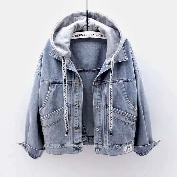 Loose Women's Short Denim Jacket Spring Autumn Hot Sale Of The Season Korean Style Long Sleeve Hooded Jacket with Large Pockets