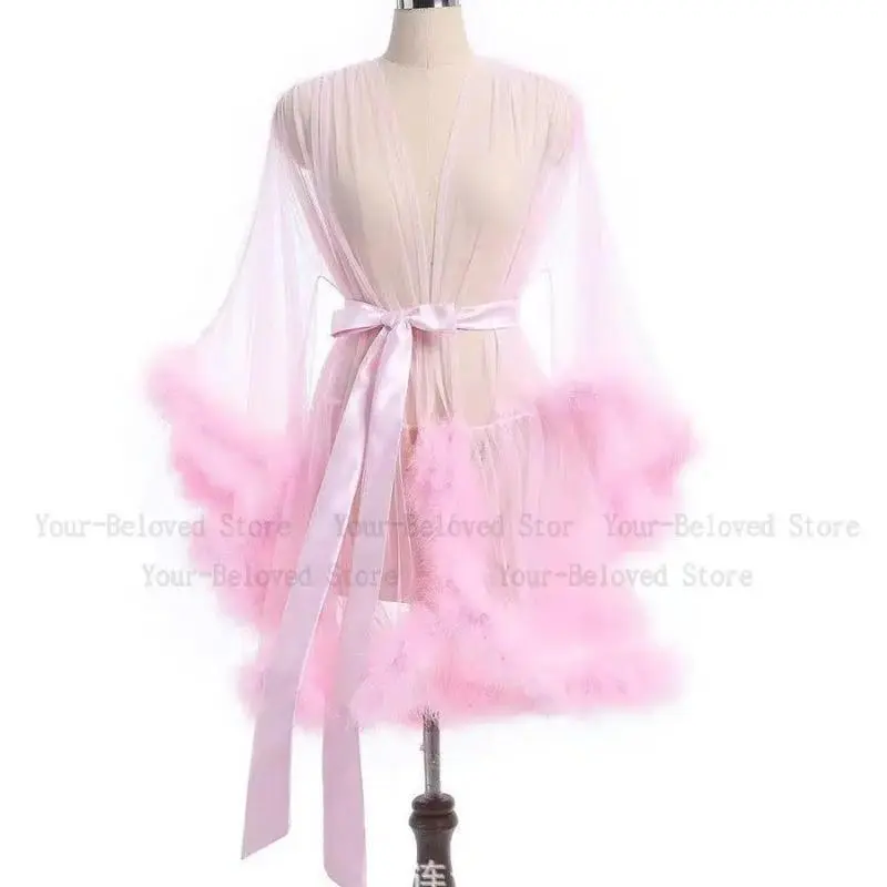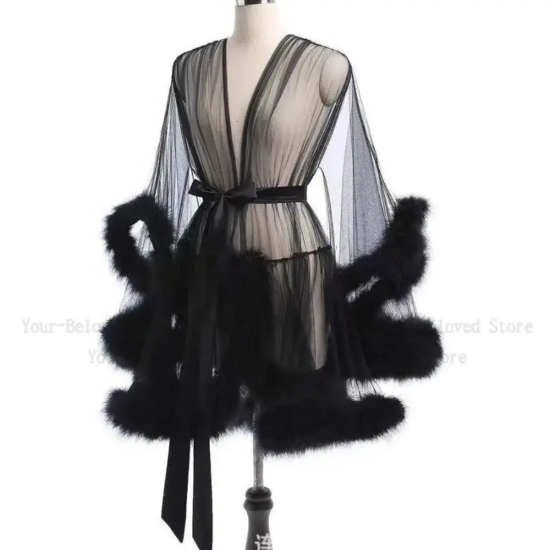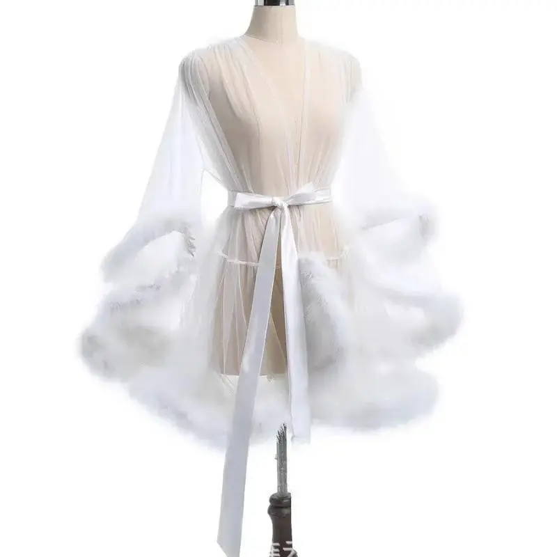 SexyFeatherRobeSeductiveMeshBathrobeFashionLongSleevePlushSplicedThinLingerieFemaleUnderwearNightgownSheerRobe