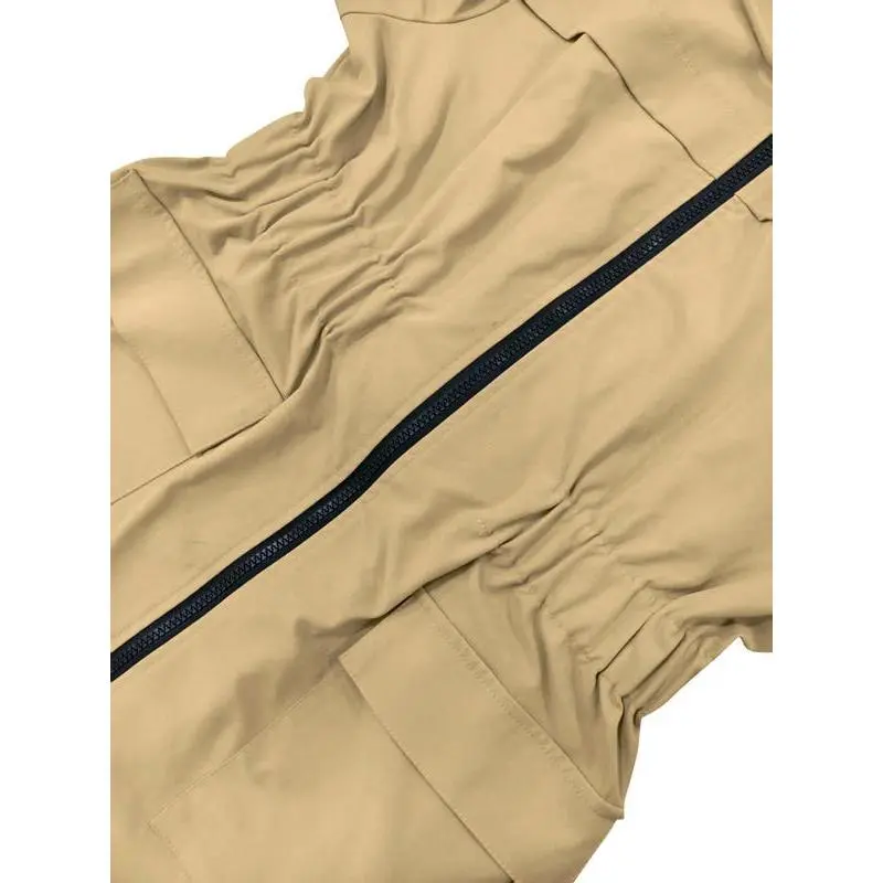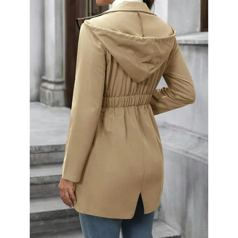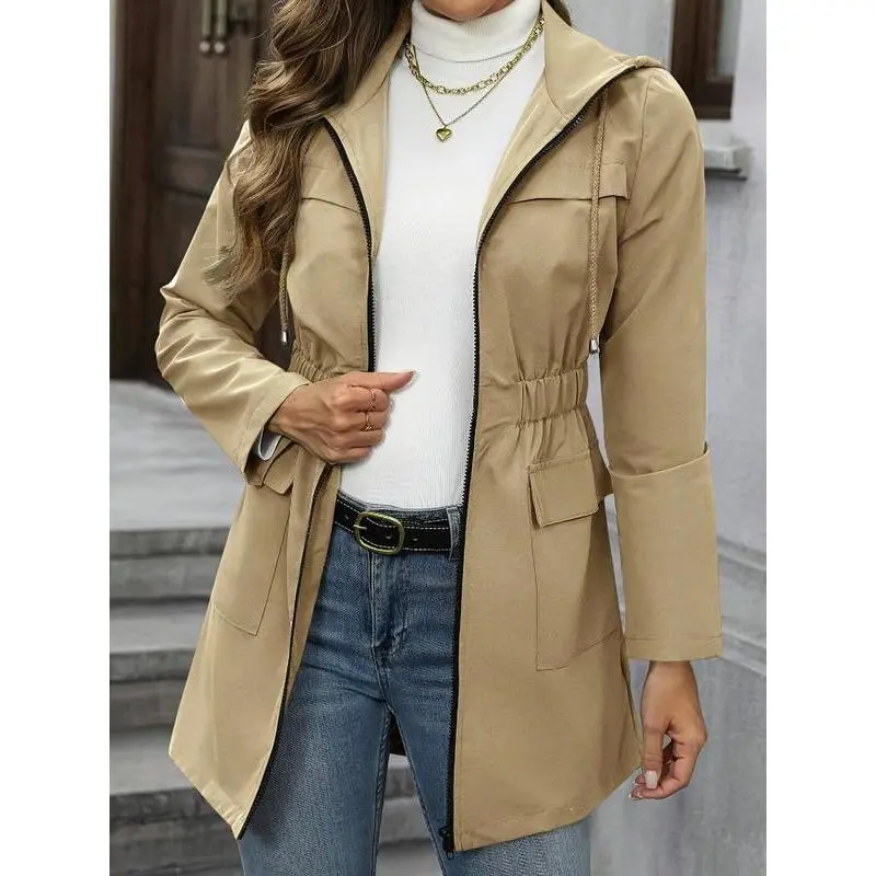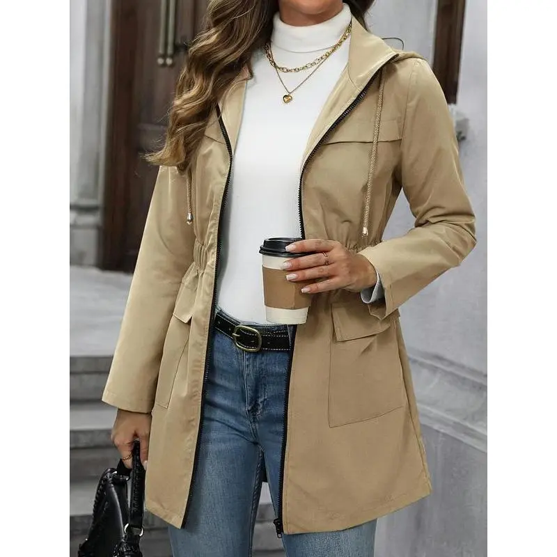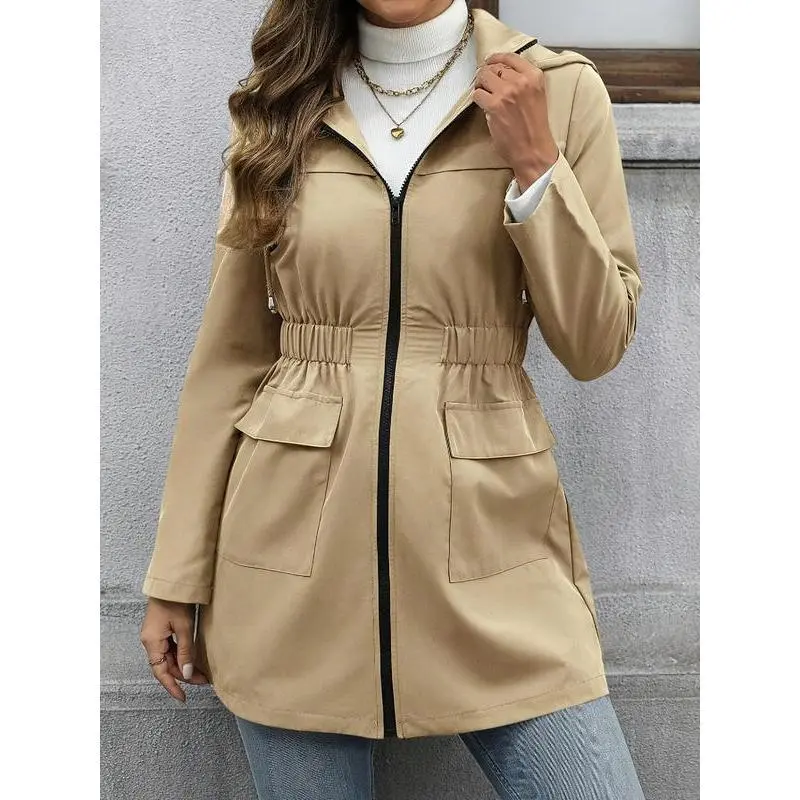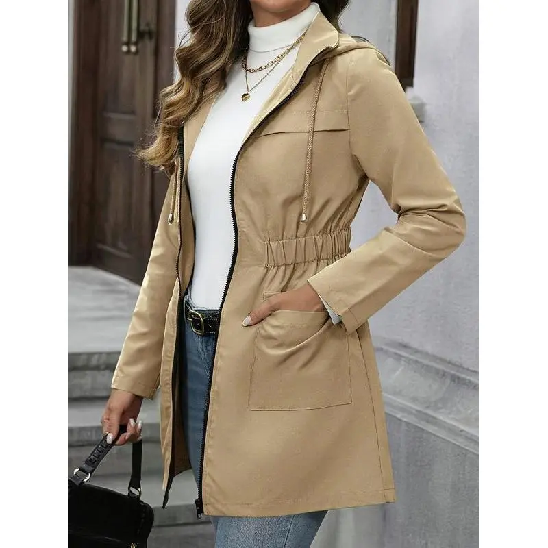 A ladies' khaki fitted hooded drawstring zipper pocket casual coat with a stylish design, suitable for all seasons and versatile for various occasions.