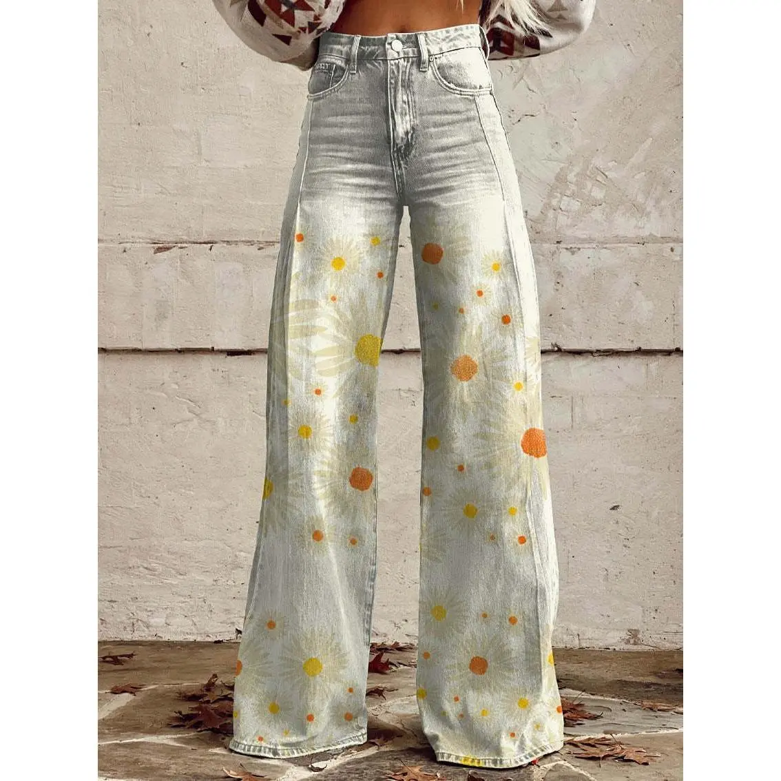 [Denim Print/Imitation Denim] Women's Western Cowboy Print Wide-Leg Pants - All-Season Casual Trousers with Vibrant Digital Design, Machine Washable Durable Fabric for Home & Outdoor Wear, Relaxed Setting Apparel, Cowboythemed Attire, Nonst