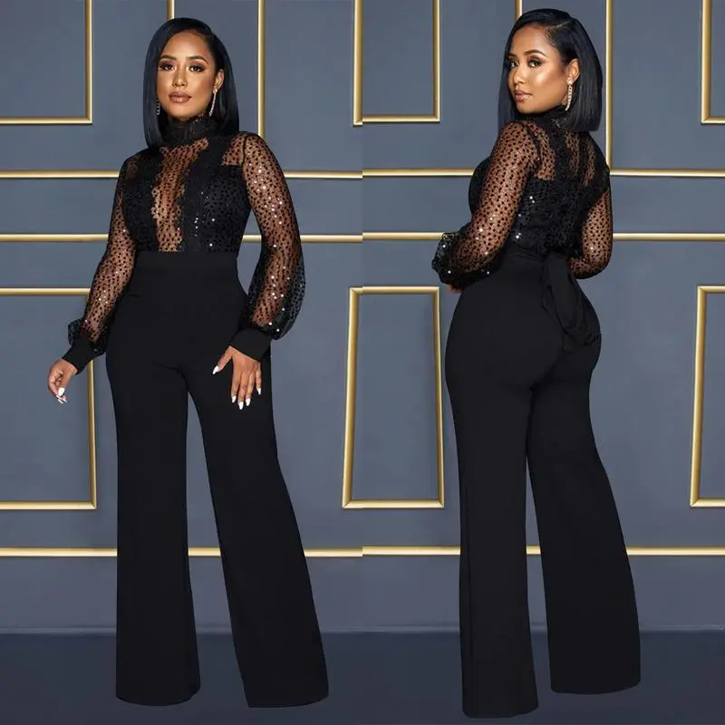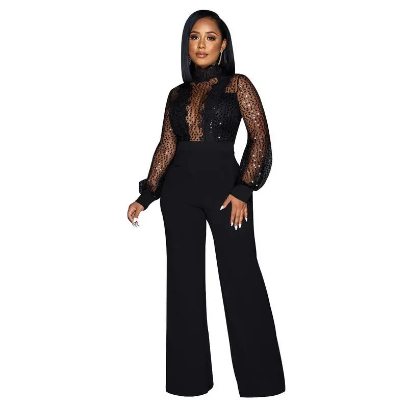 Women's sequined mesh high neck jumpsuit long sleeved transparent tight pants set