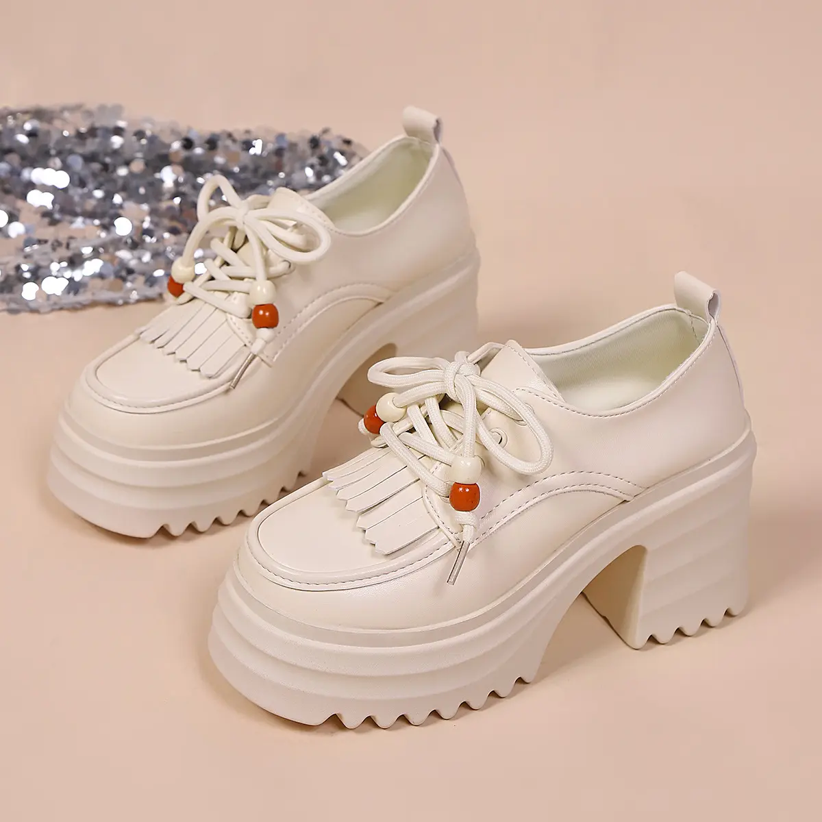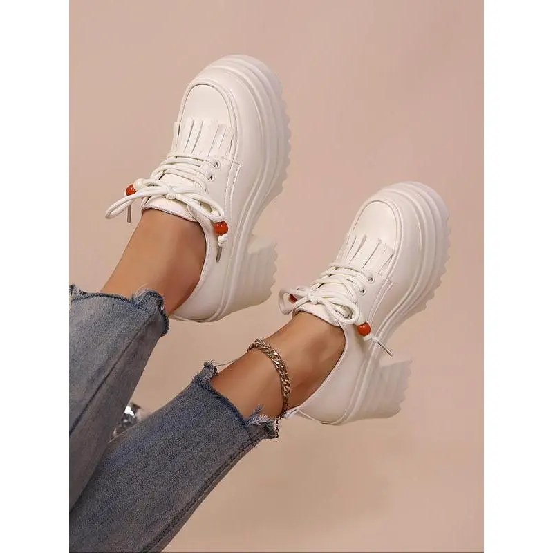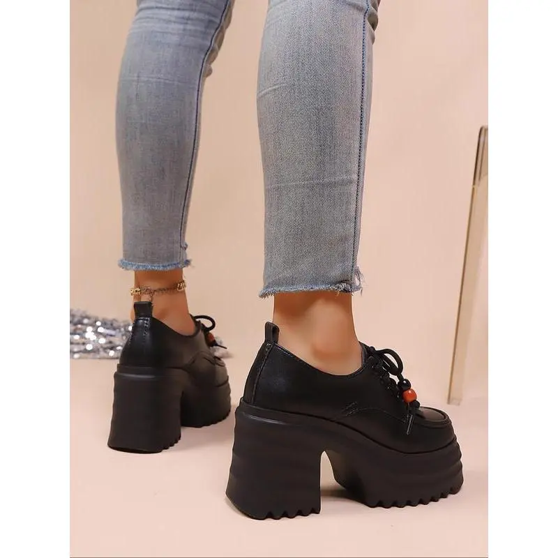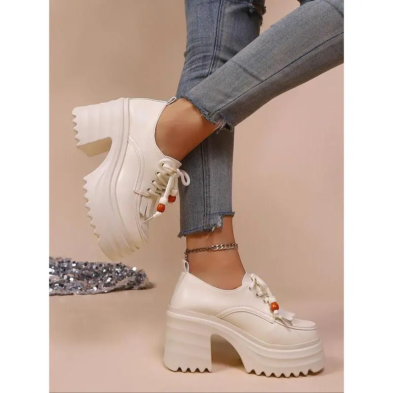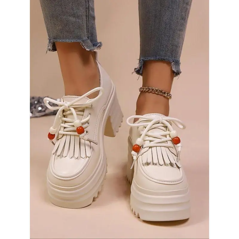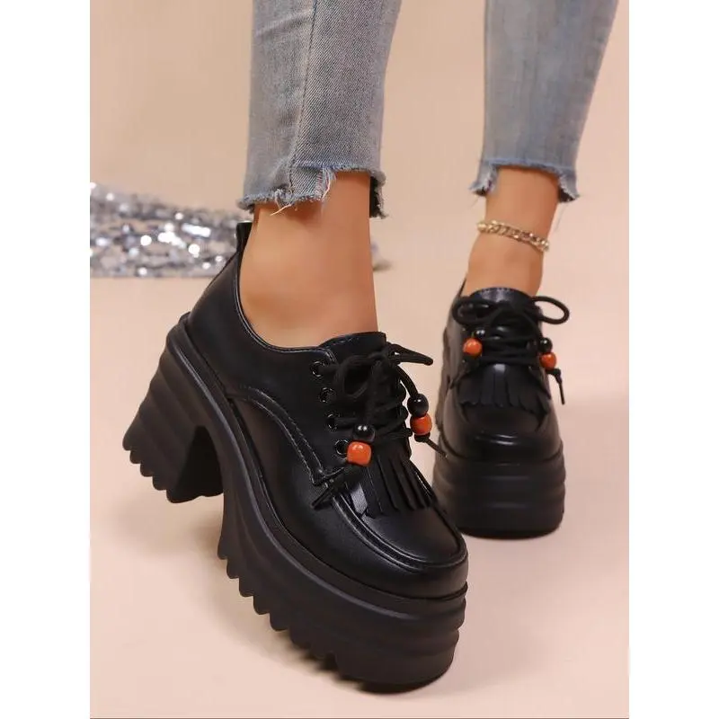 Punk Style Thick Sole Platform Shoes for Women, New Arrival Tassel Tie-Up Chunky Heel Retro Height Increasing Single Shoe