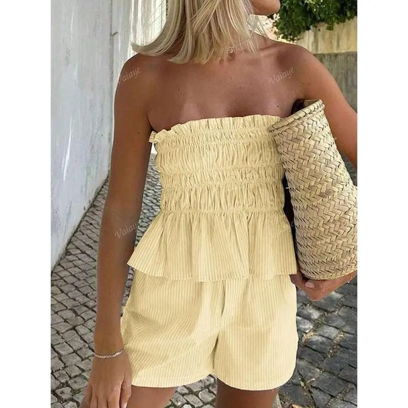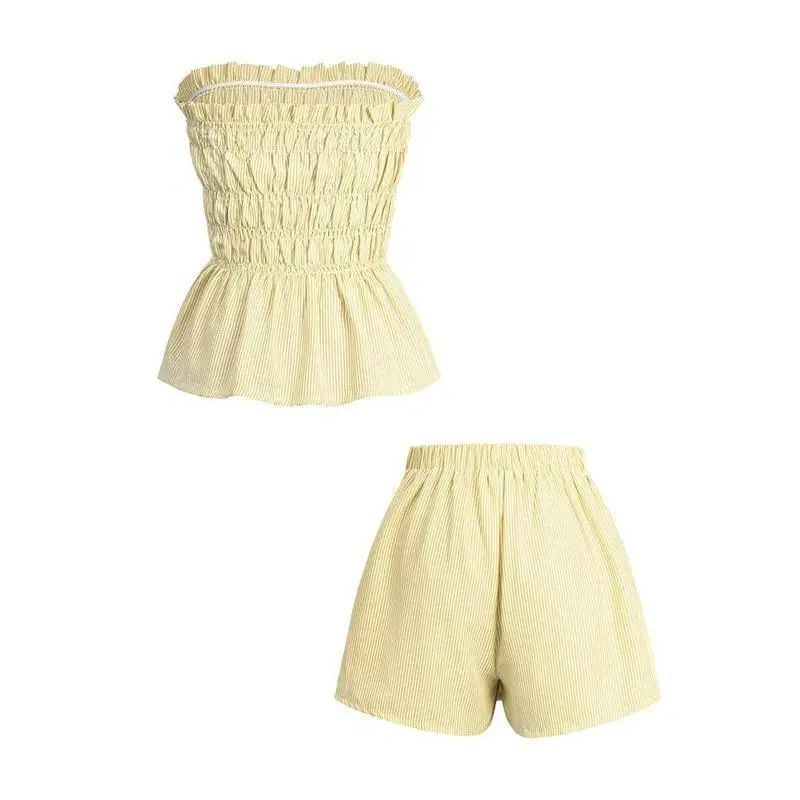 Neckline:Strapless/Occasion:Night Out, Home/Festivals:Back-to-School, Valentine's Day, Commencement/Graduation Season/Lined For Added Warmth:No/Pattern Type:Plain/Tops Body:Unlined/Features:Great quality/Details:Frill, Ruffle Hem, Shirred/Style:Boho/Color:Yellow/Top Type:Bandeau/Tops sleeve length: sleepveless/Bottom Type:Shorts/Tops Length:Crop/Number of Pieces:2 Piece Set/Tops Material:Woven Fabric/Tops Composite: 70% polyester, 30% viscose/Fit Type:Slim Fit/Fabric:Slight Stretch/Care Instructions:Machine wash, do not dry clean/Sheer:No
