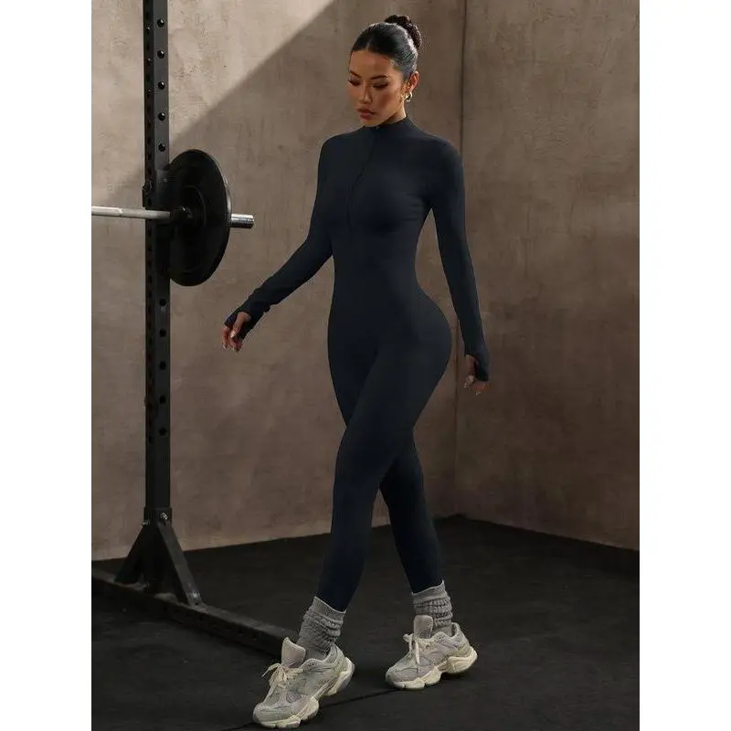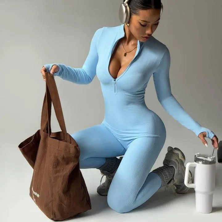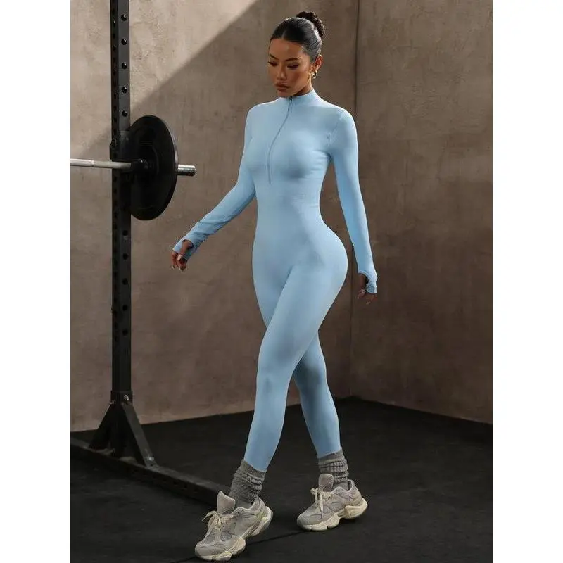 Yoga Bodysuit Long Sleeve Seamless Tight One-piece Aqua Blue Fitness Wear for Women 90% Nylon 10% Spandex S M L Sizes