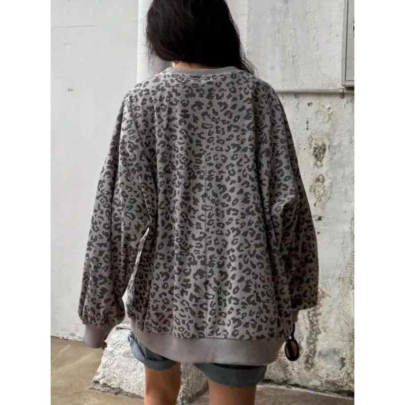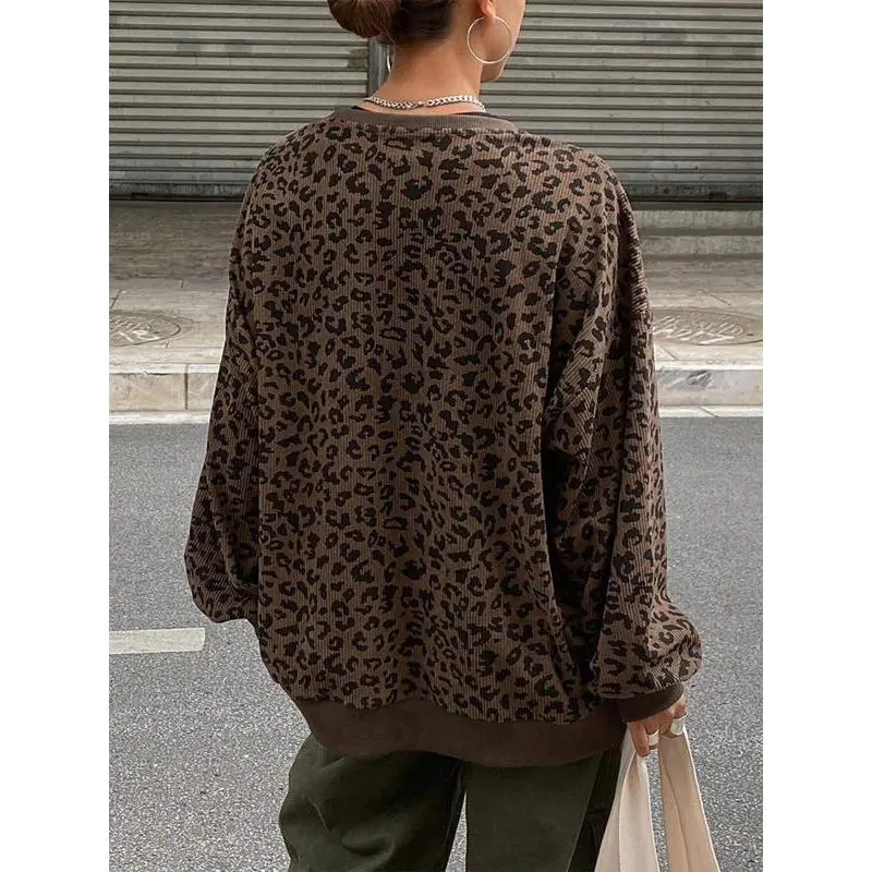 Women Loose Fit Round Neck Corduroy Leopard Print Ribbed Sweatshirt,Long Sleeve Tops,Fall Clothes,Back To School Clothes