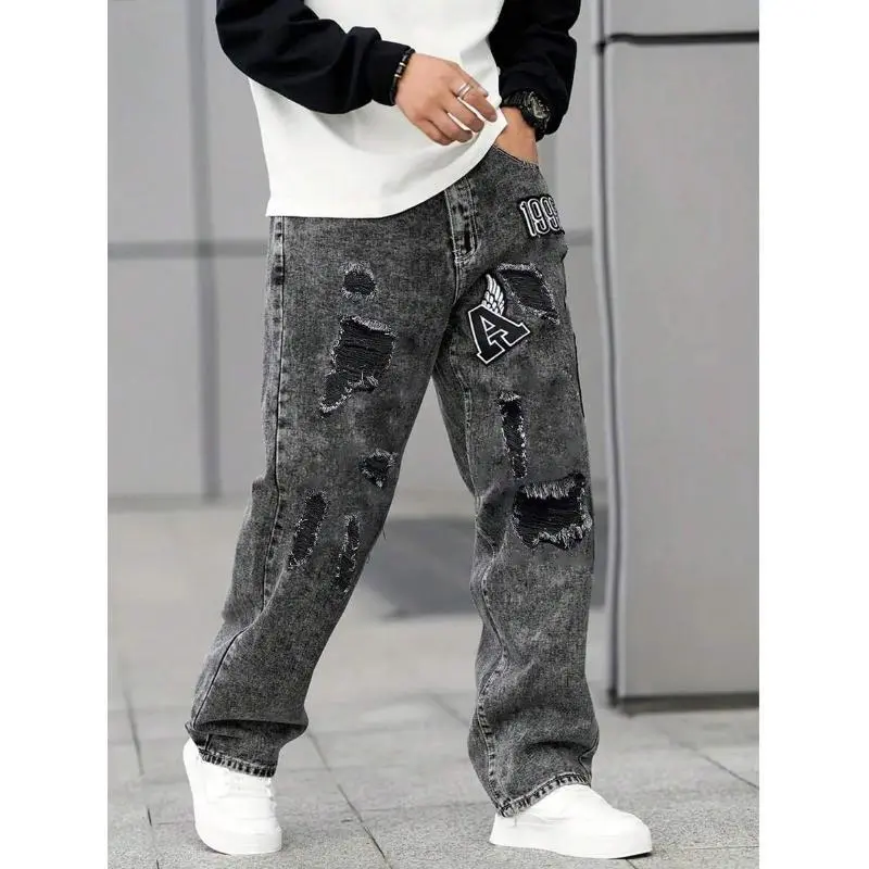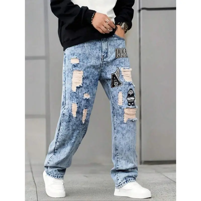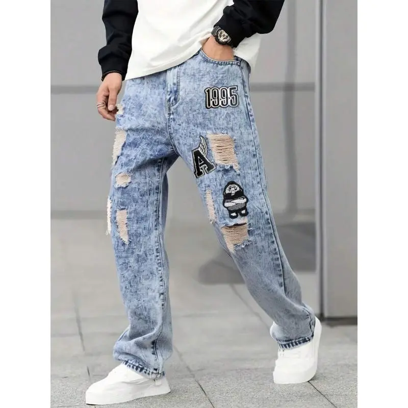 Men'sFashionDistressedEmbroideryPatternDenimJeans,EmoStyleFabricMenswear