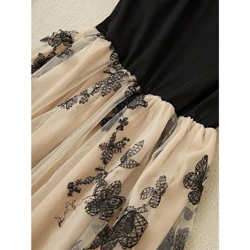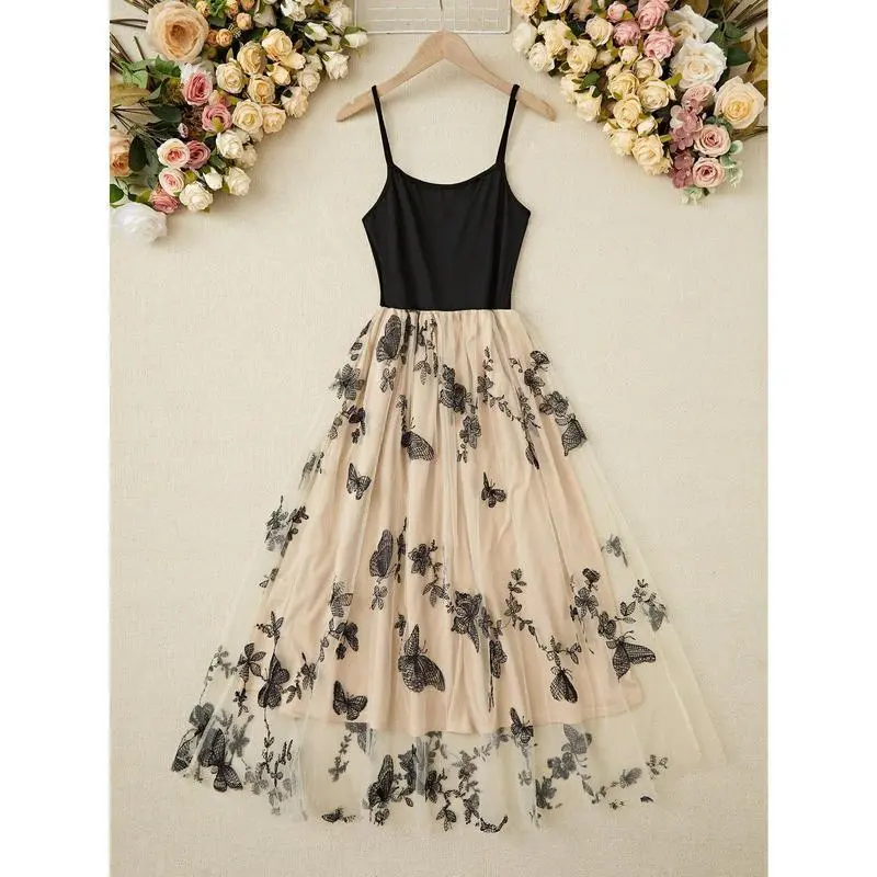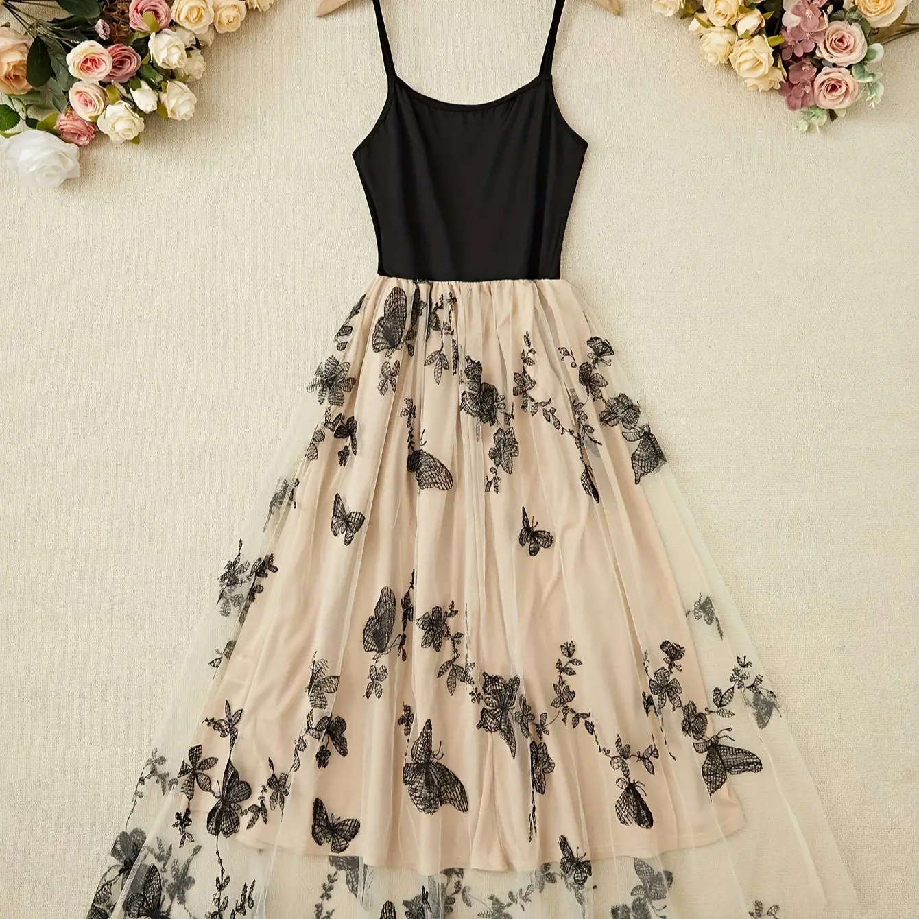 Butterfly & Flower Embroidery Contrast Mesh Splicing Cami Dress With Thin Straps Maxi Vacation Beach Outfits Women