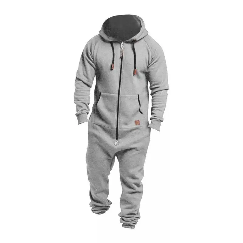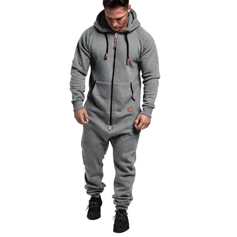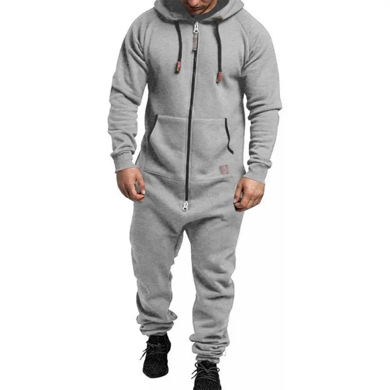 Men's Thermal Fleece Lined Hooded Jumpsuit with Pockets, Full Zipper, Long Sleeves, Adjustable Drawstring, Brown Workwear, Comfortable Sportswear