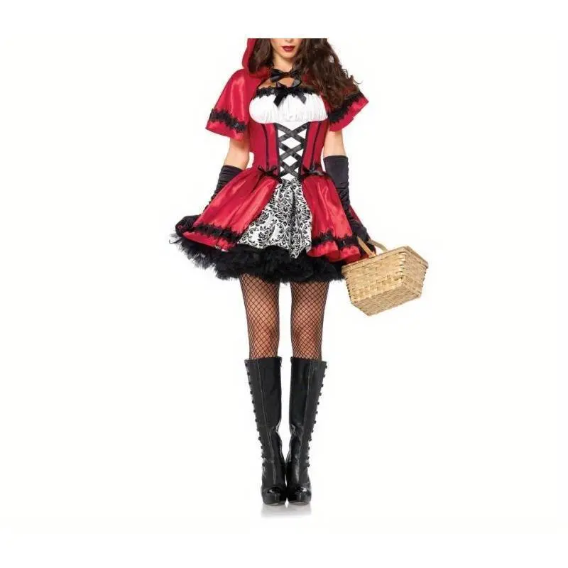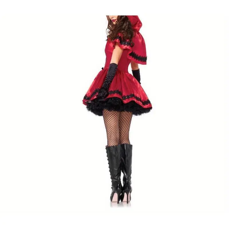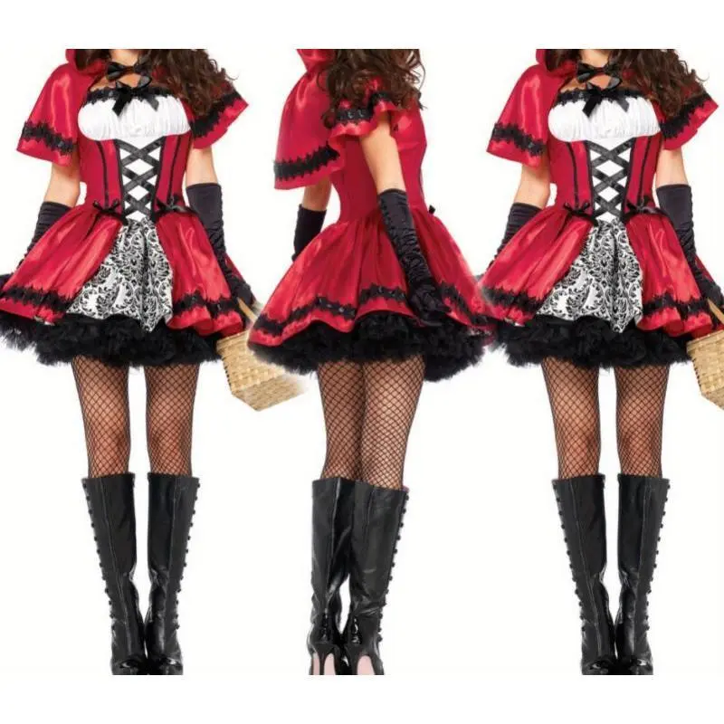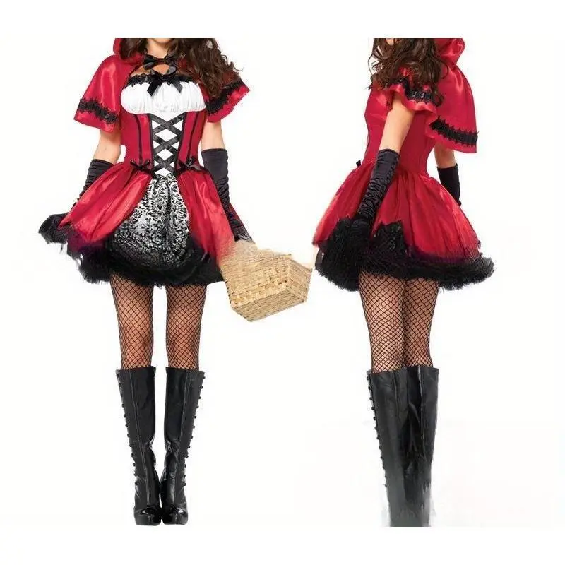 SexyAnimeQueenRedRidingHoodCostumeGothicStyleFishnetStockingsRedHoodBlackAccentsWitchBroomHalloweenCosplayThemedParties