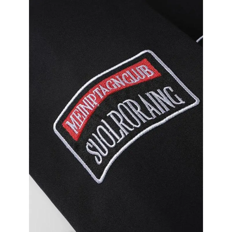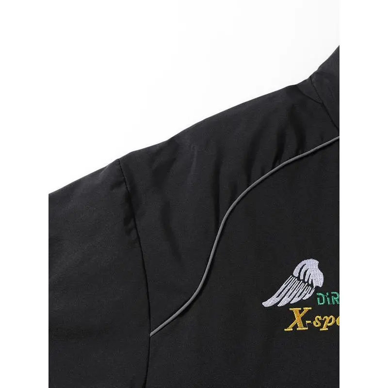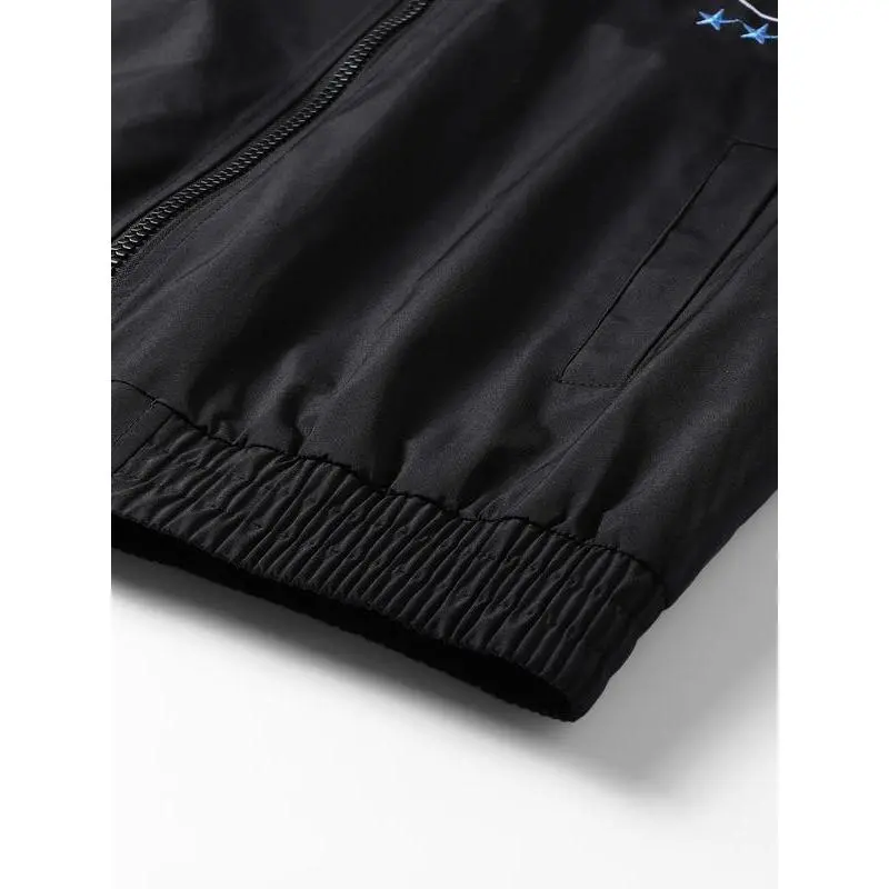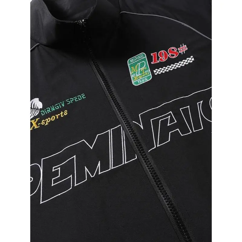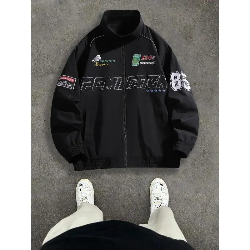 ��Racing-Inspired��: Features a unique racing style with bold embroidery, setting it apart from traditional jackets. ��Letter Print��: Contains eye-catching letter prints that add a distinct visual element to the classic bomber silhouette. ��Spring & Fall Use��: Optimized for transitional seasons, providing suitable thickness for varying temperatures during spring and fall. ��Moderate Fabric Thickness��: Crafted from medium-weight fabric, balancing durability and comfort for everyday wear. ��Fitted Cut��: Designed with a fitted silhouette, offering a streamlined look while allowing for ease of movement.