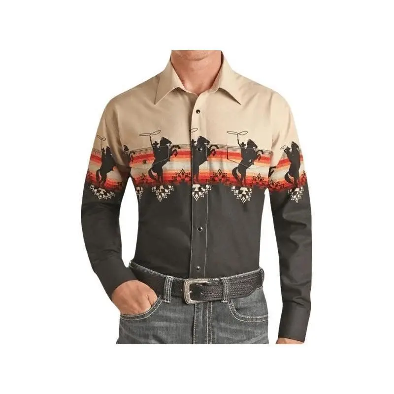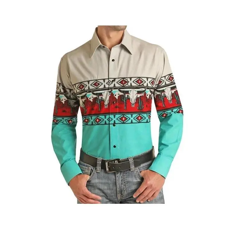 WesternCowboyPunkStylePrintedShirtforMenwithDoubleChestPockets,TrendyVintageYouthStreetwearMenswearTop.。