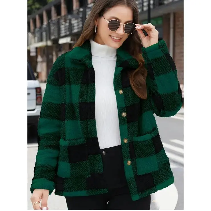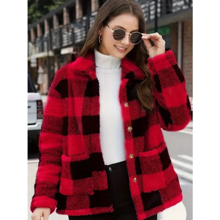 Women's plaid fluffy long winter multi-functional cheerleading jacket made of polyester fiber material