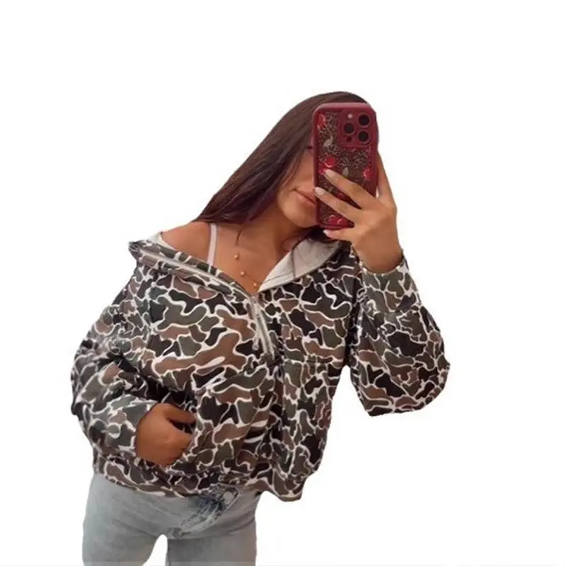 Stay Cozy in Style with our Half Zip-Up Print Sweatshirt camo - Shop Now! Womenswear Hoodie