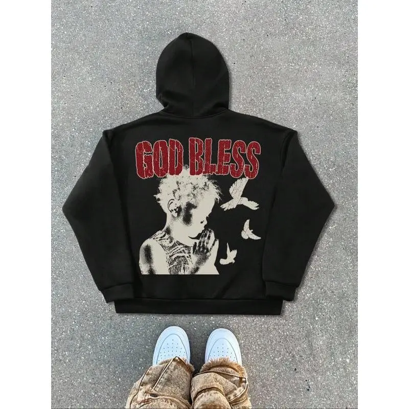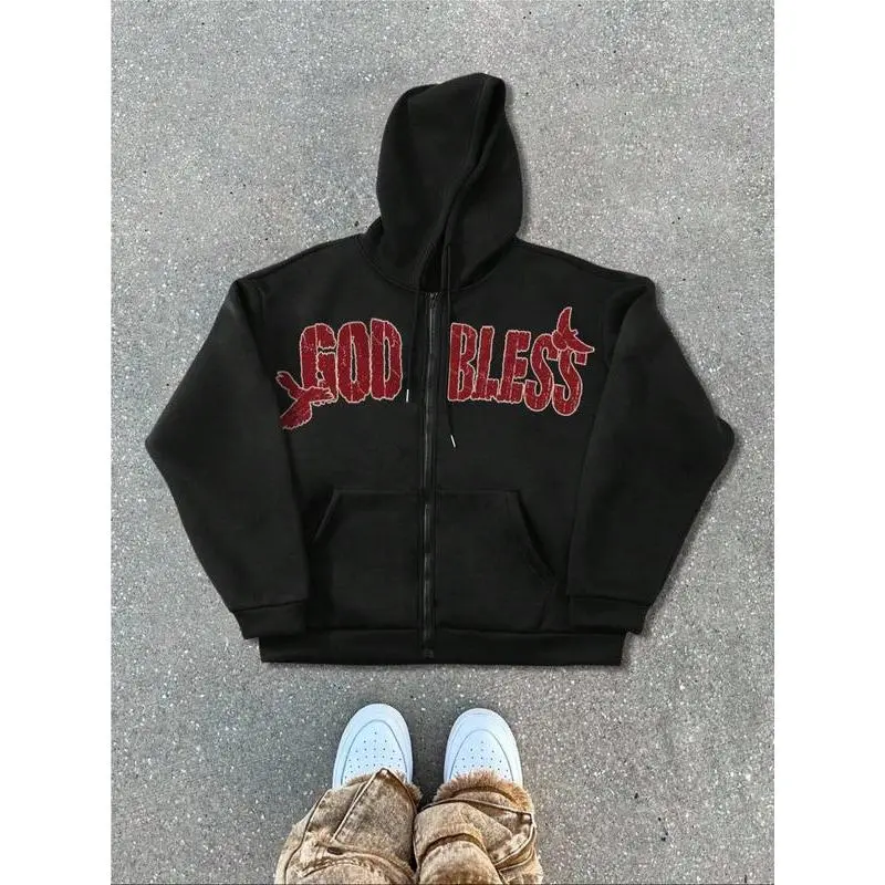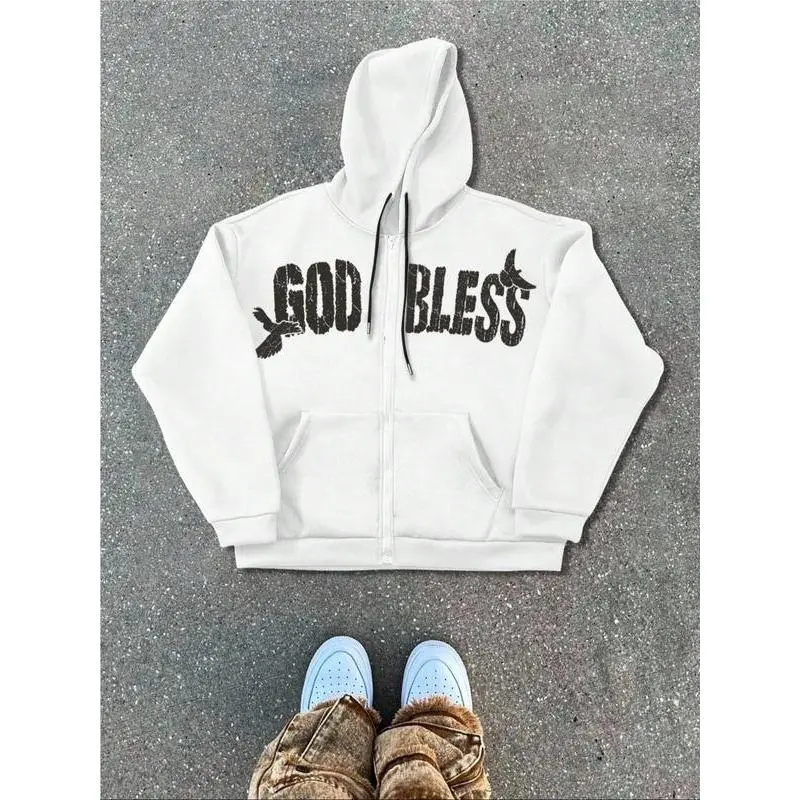 "God Bless" Religious Graphic Zip - Up Hoodie, Spiritual Streetwear, Trendy TikTok Must - Have