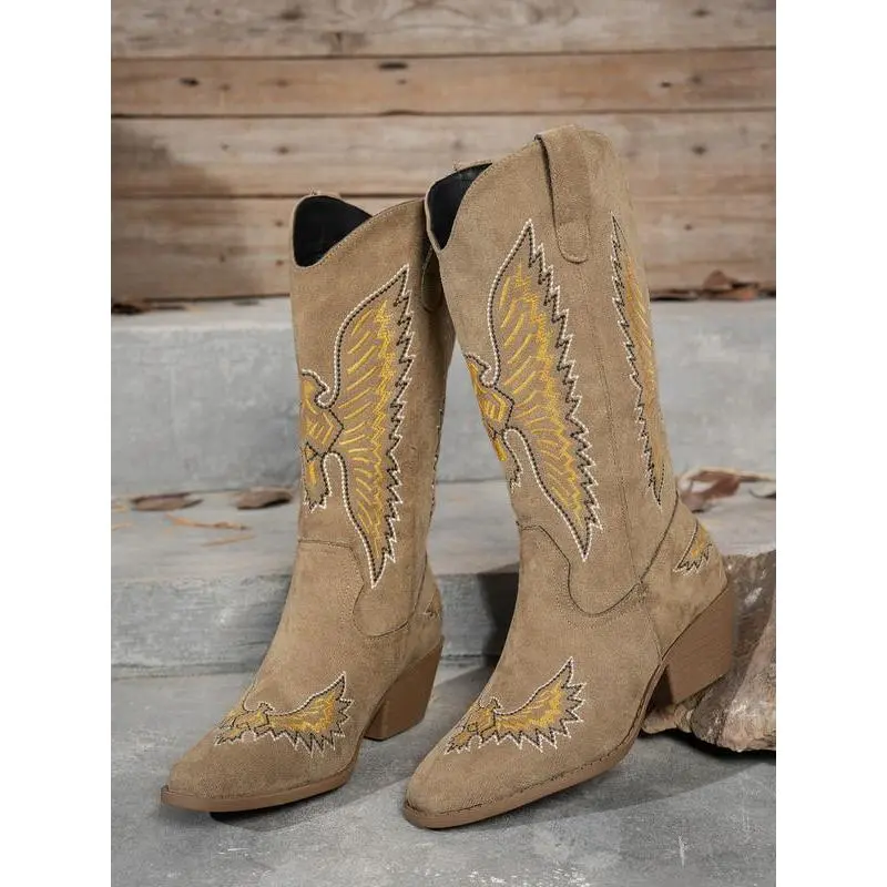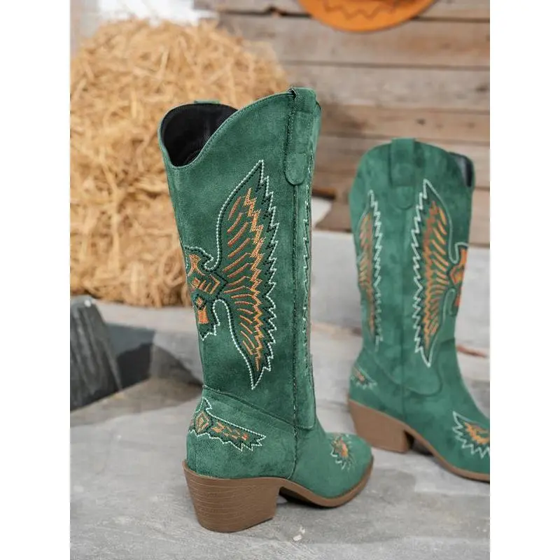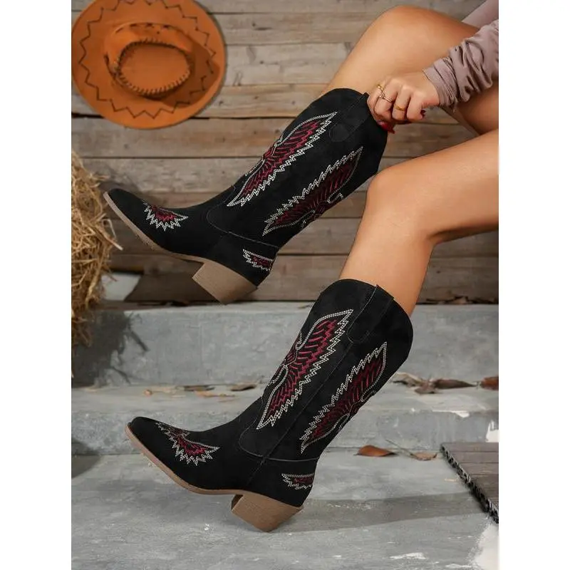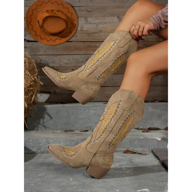 Women's Retro Western Cowboy Boots, Cowgirl Western Boots, Embroidered High-Tube Knight Boots V-Neck Long Boots, PU Leather & Rubber Sole, Fall Winter Style