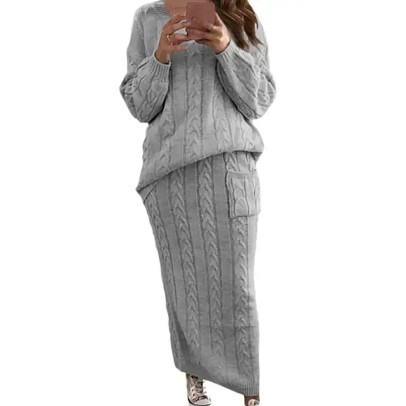 Women's Cable Knit Two-Piece Set - Solid Sweater, Long Skirt with Pocket & Round Neck