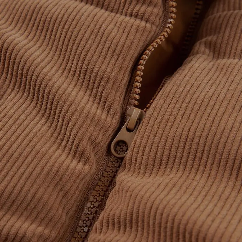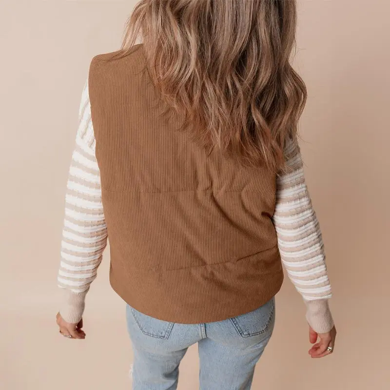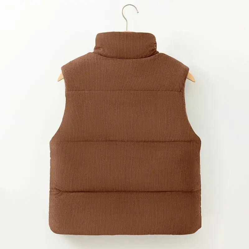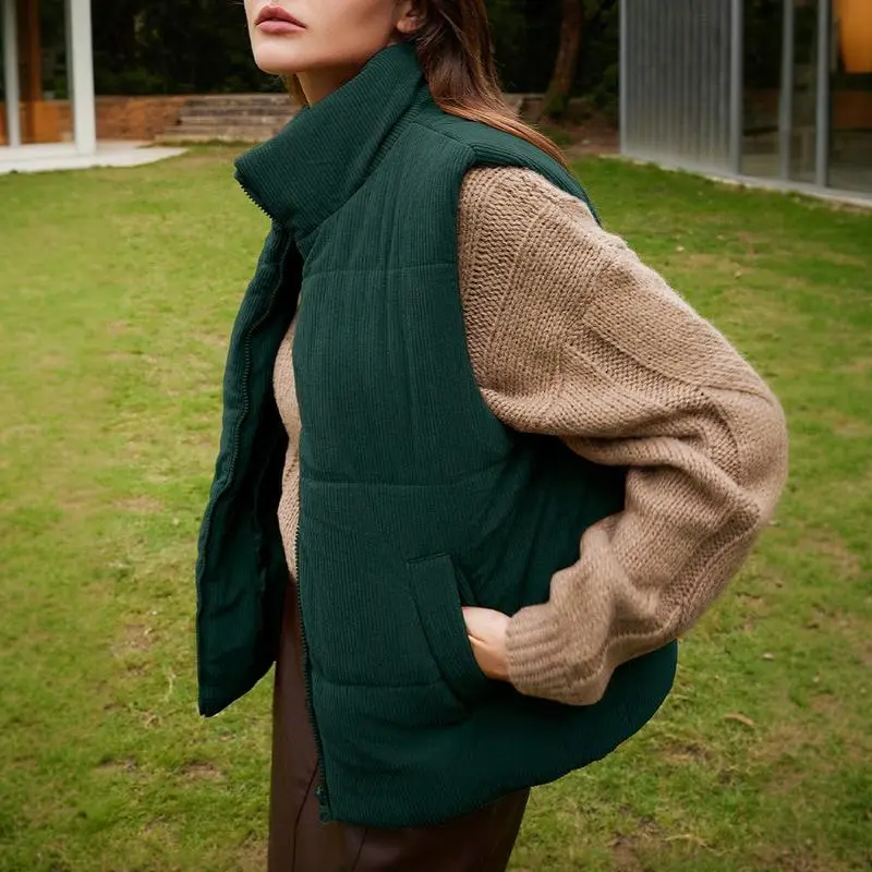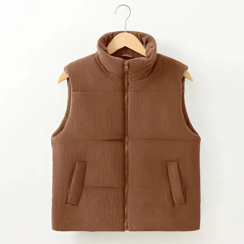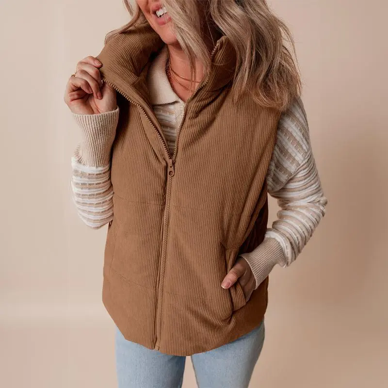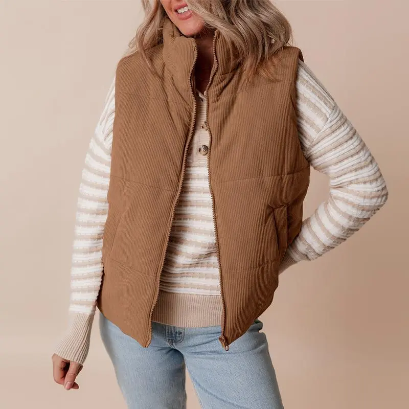 Women's Corduroy Stand Neck Zipped Puffer Vest Fall Outfit Basic Casual Vest