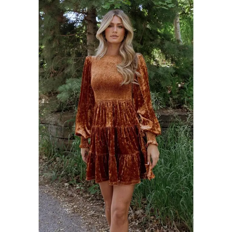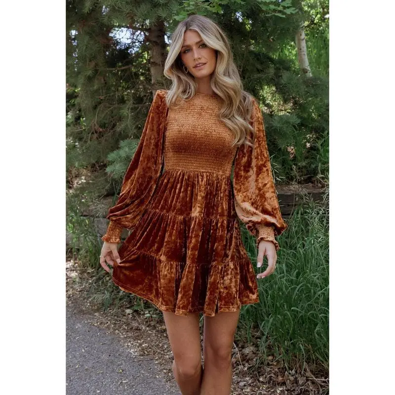 FEATURES:VelvetFabric,LongSleeve/PuffSleeve,CrewNeck,ElasticSmockedTop,BackButton,EmpireWaist,ElasticRuffleCuffs,TieredRuffleSkirt,A-LineSwingHemandMiniLength.