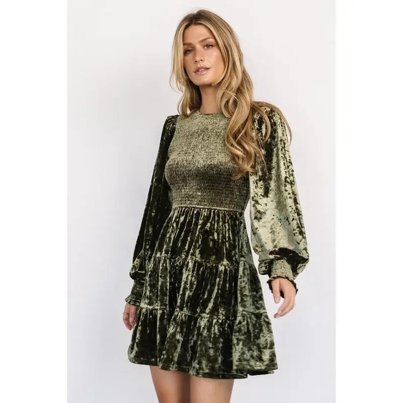 DESIGN:Thistieredruffledressisfullofdetaileddesign!thecrushedvelvettexturegivesitanotherboost.Andpuffsleevedesignattheconnectionbetweentheshouldersandsleevesgivesthiscutedressacharacterandaluxurioustouch.theruchedontheupperbodynotonlyaddsstyle,butalsoprovidesstretchycomfort.